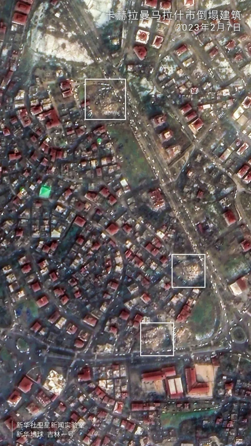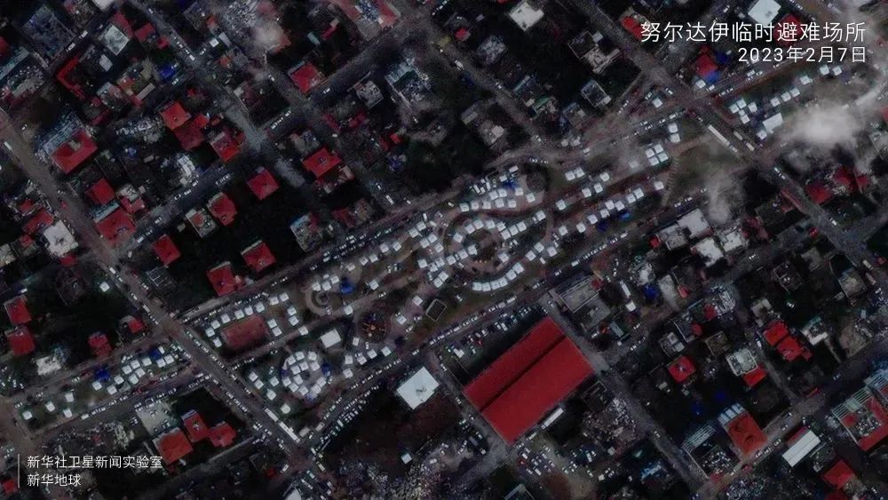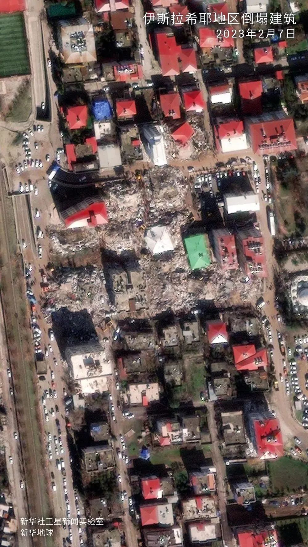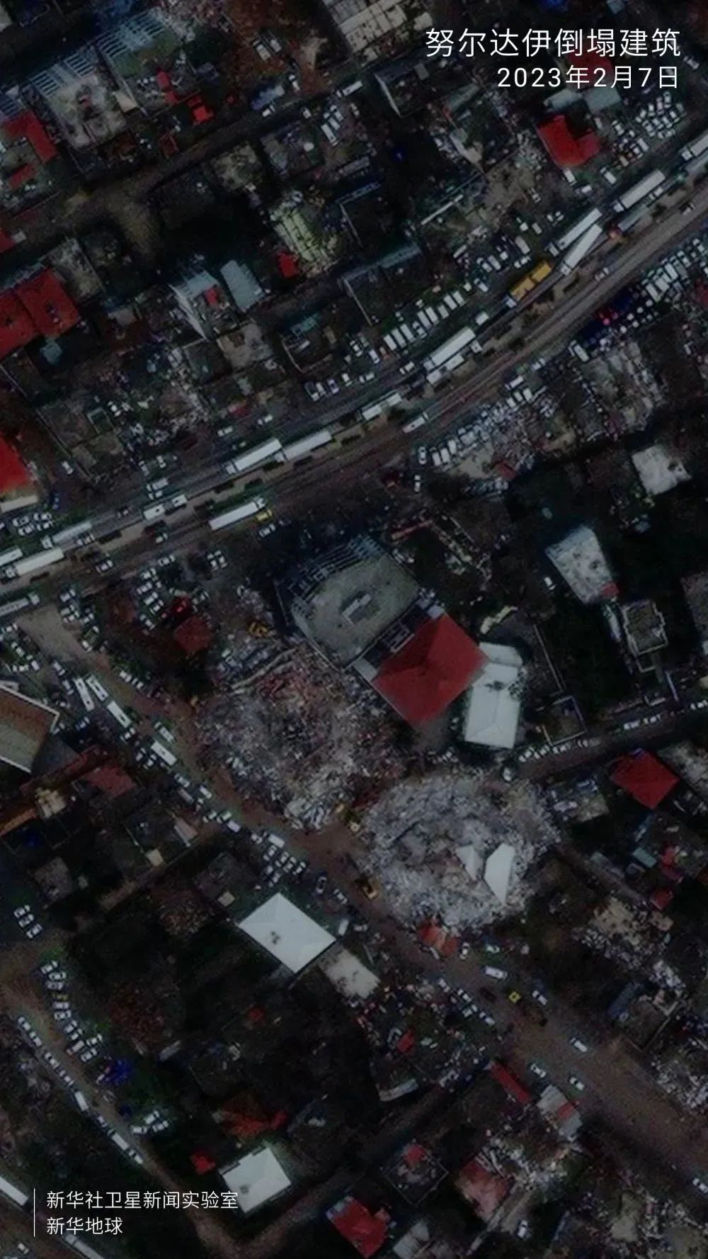 从卫星影像可见,一组住宅楼几乎全被夷为平地,建筑碎片散落,堆满街道。图中上部显示,白色高层建筑旁的红色屋顶发生位移、走向明显扭曲。
