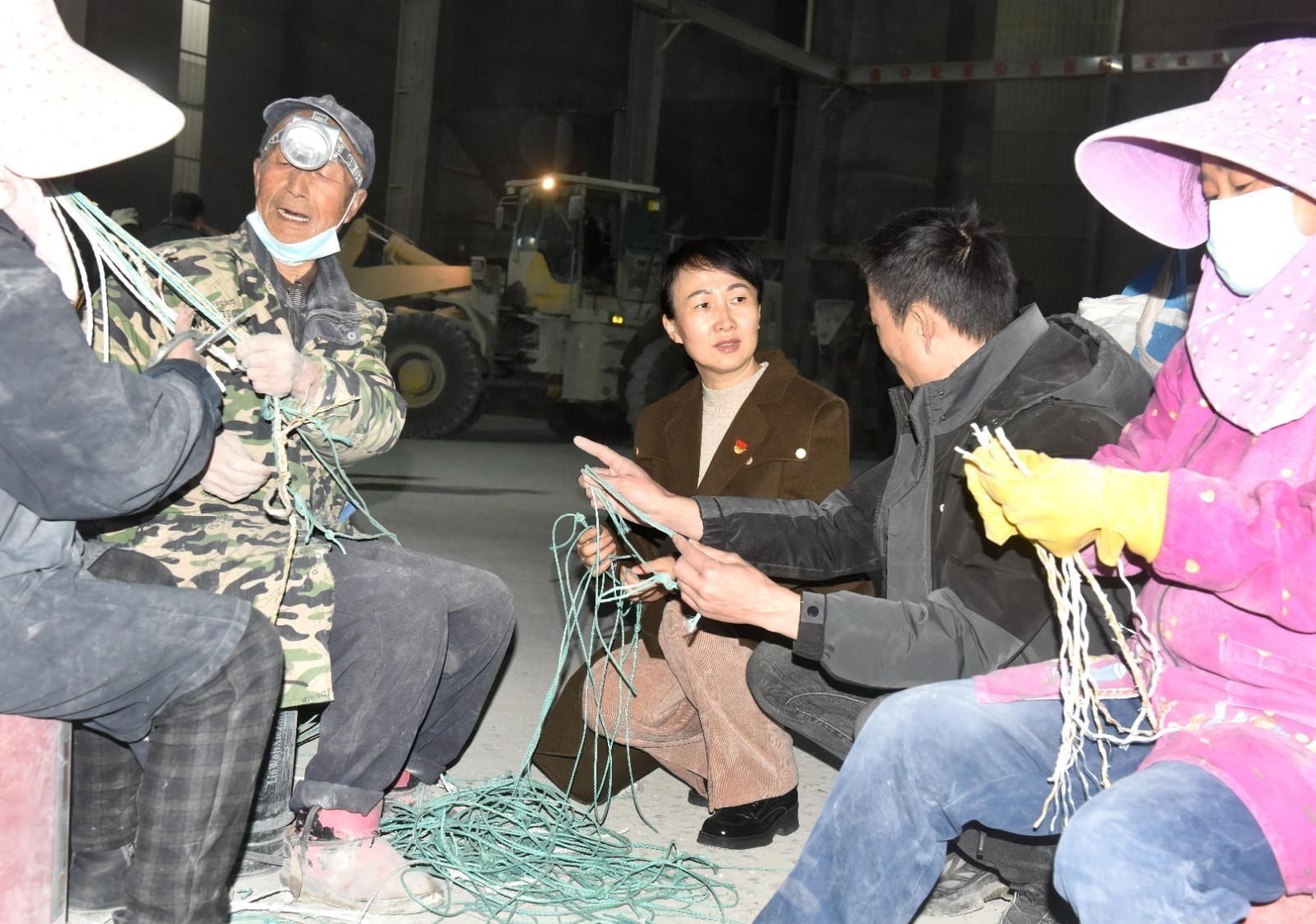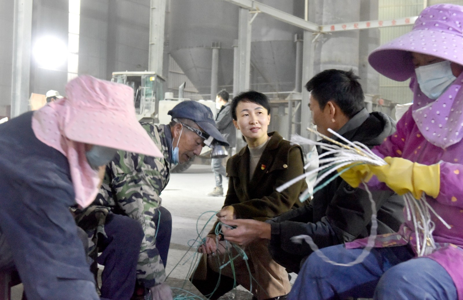 2023年2月13日,在江西景德镇市乐平市塔前镇塔前工业园区的乐平市宏成建材有限公司生产车间内,来自该镇营商办工作人员(中)正向该公司负责人和员工了解春节后的生产、销售、用工、待遇以及亟需解决的困难、问题等。