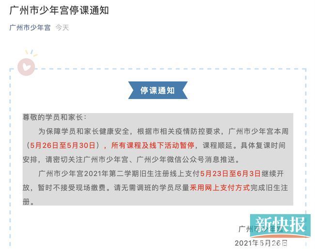 26下午,在广州市少年宫官方微信发布消息,为保障学员和家长健康安全,根据市相关疫情防控要求,广州市少年宫本周(5月26日至5月30日),所有课程及线下活动暂停,课程顺延。具体复课时间安排,请密切关注广州市少年宫、广州少年微信公众号消息推送。