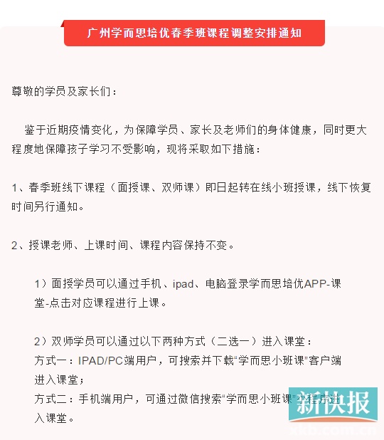 广州学而思的官方微信号发出“广州学而思培优春季班课程调整安排通知”。通知指,鉴于近期疫情变化,春季班线下课程(面授课、双师课)即日起转在线小班授课,线下恢复时间另行通知。另外,授课老师、上课时间、课程内容保持不变。