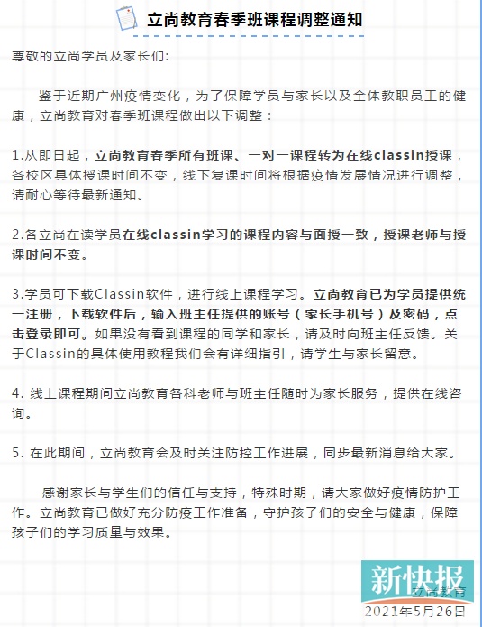 5月26日下午,广州立尚教育在微信号发出“春季班课程调整安排通知”,通知指,鉴于近期广州疫情变化,为了保障学员与家长以及全体教职员工的健康,立尚教育对春季班课程做出以下调整:从即日起,立尚教育春季所有班课、一对一课程转为在线classin授课,各校区具体授课时间不变,线下复课时间将根据疫情发展情况进行调整,请耐心等待最新通知。各立尚在读学员在线classin学习的课程内容与面授一致,授课老师与授课时间不变。