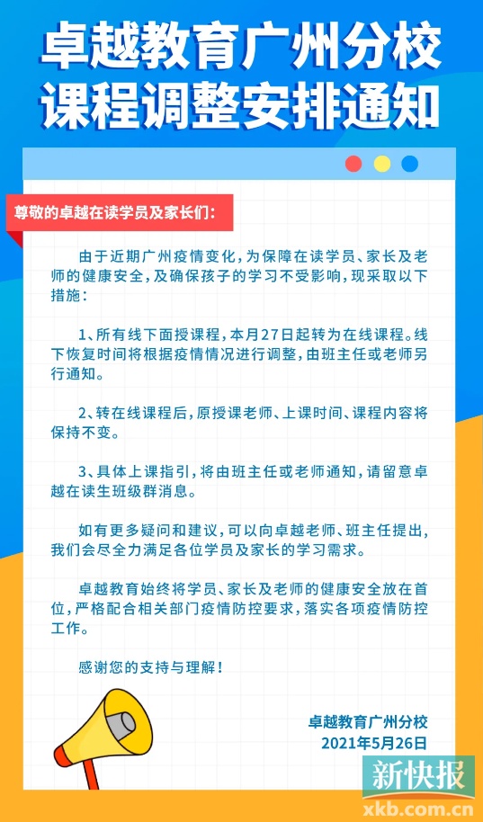5月26日,广州市少年宫、广州学而思培优、广州立尚教育、卓越教育广州分校、广州新东方等多家教育机构发布通知,暂停线下课程和活动。