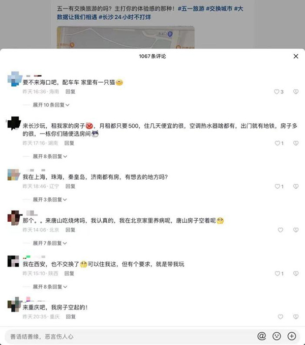 IP地址是山东的网友“Tina”就在小红书上发布了一则“突然想交换旅游,济南有车有房”的帖子,公开招募交换对象。她告诉澎湃新闻,自己是95后的独生女,“家里有半个庄园、私教以及边牧,很适合四海八荒的盆友来这小住”。