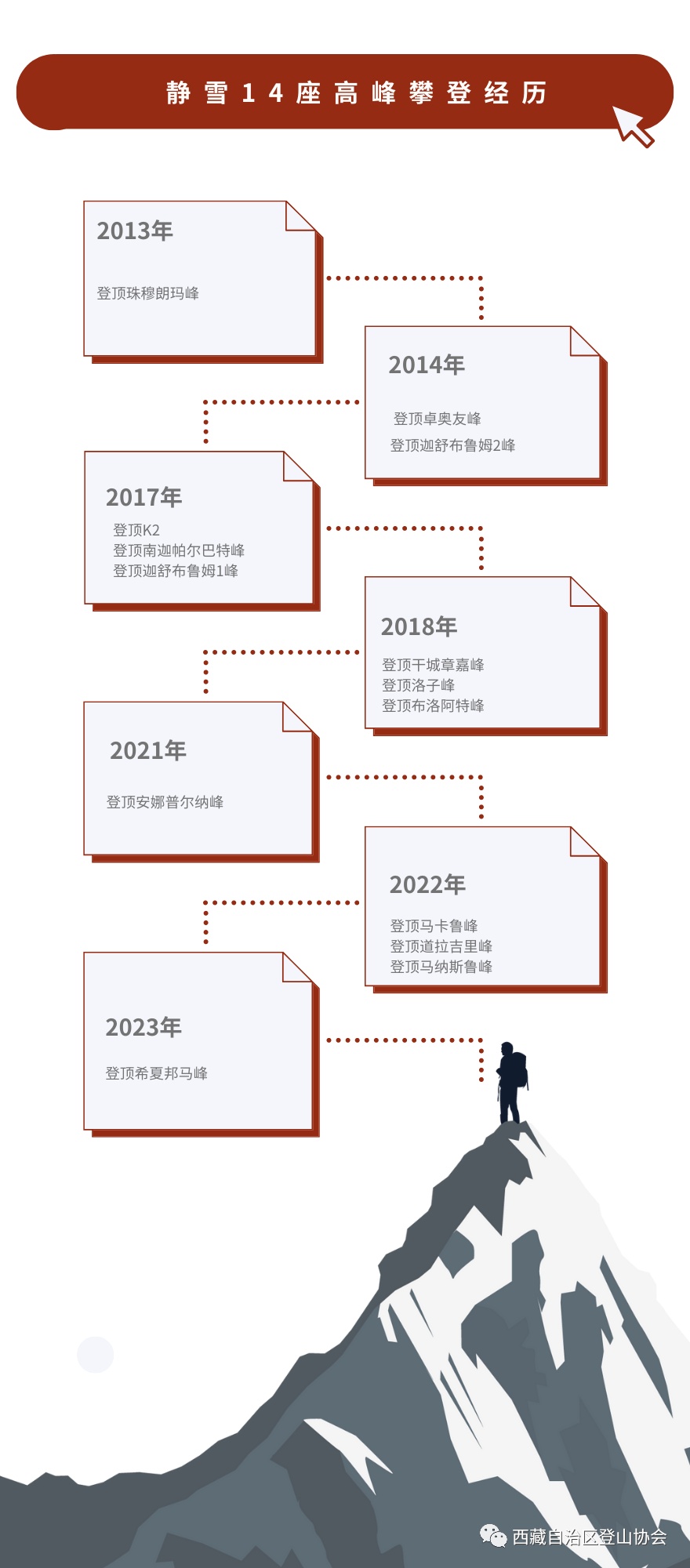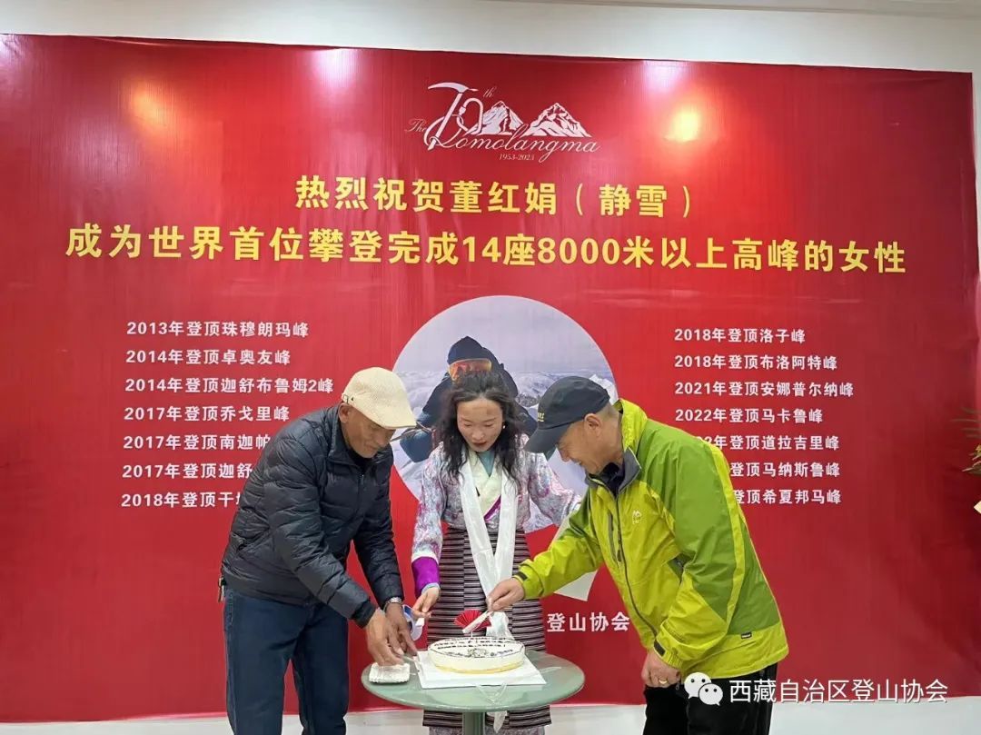 最后,西藏自治区登山协会衷心祝贺董红娟女士(静雪)成功登顶希夏邦马峰,成为世界首位完成攀登14座8000米以上高峰的中国女登山者。
