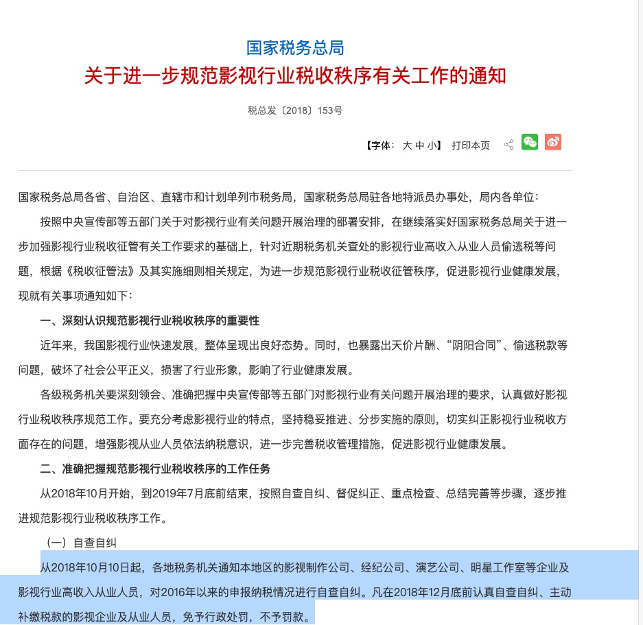 时间追溯到2018年。国家税务总局发布了《关于进一步规范影视行业税收秩序有关工作的通知》,通知里明确要求:“从2018年10月10日起,各地税务机关通知本地区的影视制作公司、经纪公司、演艺公司、明星工作室等企业及影视行业高收入从业人员,对2016年以来的申报纳税情况进行自查自纠。凡在2018年12月底前认真自查自纠、主动补缴税款的影视企业及从业人员,免予行政处罚,不予罚款。”