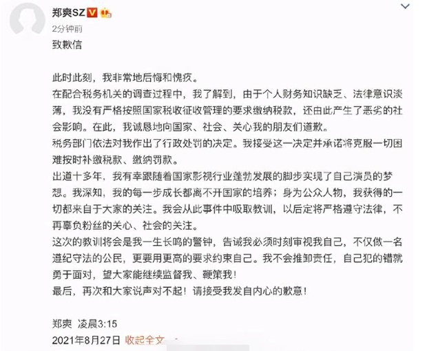 在8月27日凌晨发布的道歉声明中,郑爽表示:“由于个人财务知识缺乏、法律意识淡薄,我没有严格按照国家税收征收管理的要求缴纳税款,还由此产生了恶劣的社会影响。”