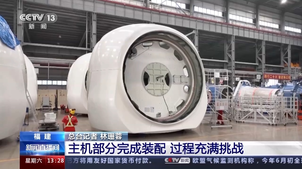 16兆瓦海上风电机组主设计师 高亚州:我们的工人正在进行机舱系统的装配,整个机舱系统有上千个零部件,需要近百道工序完成一个装配,整个装配的时长将近12天。