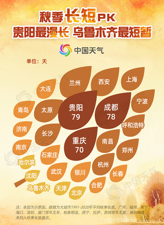 在炎热漫长的夏季和寒冷冗长的冬季之间,凉爽美丽的秋季显得弥足珍贵,但是美好总是短暂的。我国各地的秋天普遍不长,西南地区相对较长,大概在70至80天,除去春秋相连不列入盘点的昆明外,贵阳、成都、重庆在秋季长度上遥遥领先,最长的贵阳达79天,可以说拥有“最长情的秋天”。