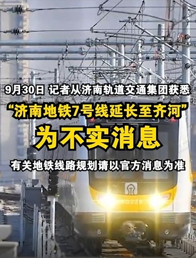 据大众网记者9月30日从济南轨道交通集团获悉,“济南地铁7号线延长至齐河”为不实消息,有关地铁线路规划请以官方消息为准。