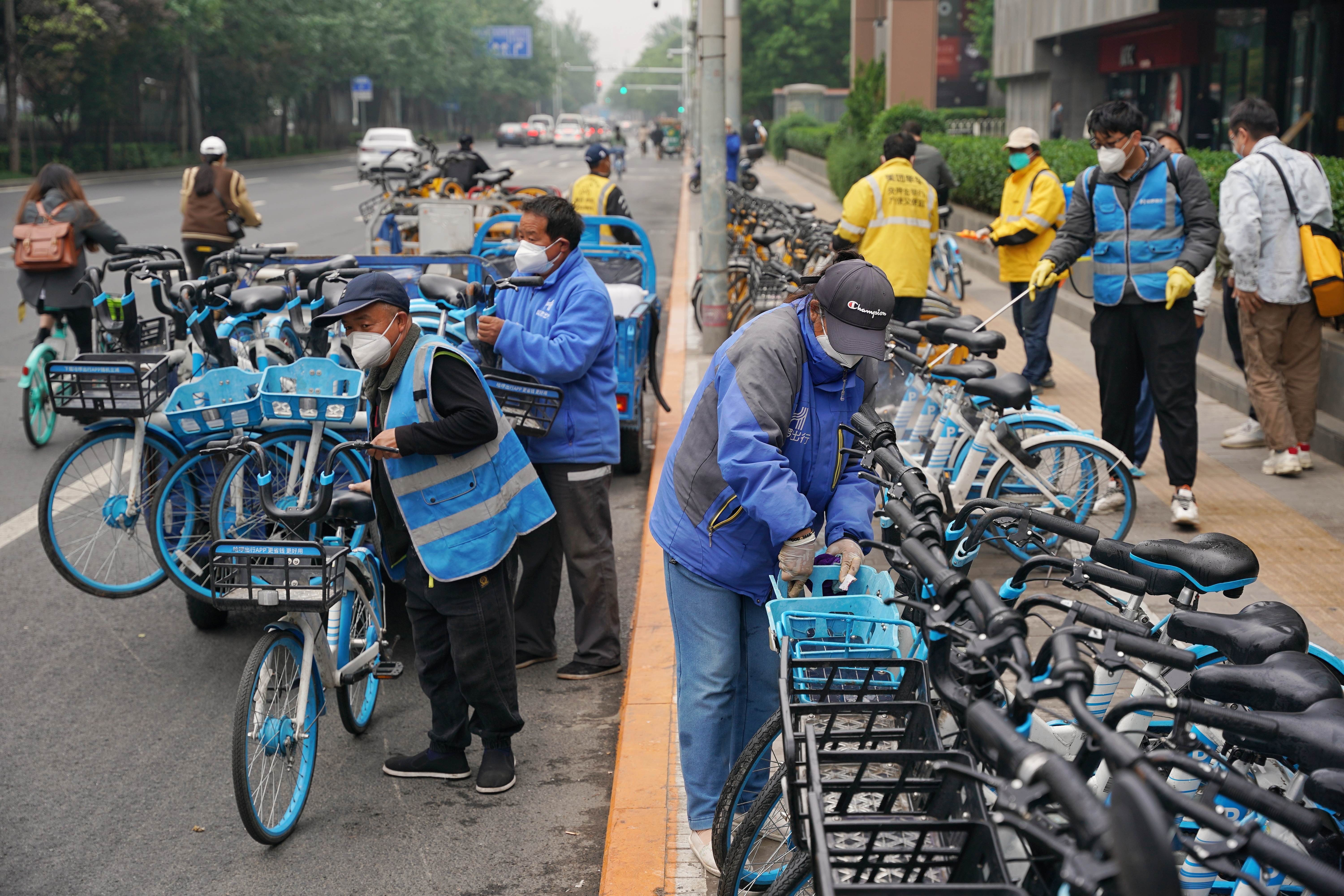 共享单车企业运维人员正在对车辆进行无差别消杀。新京报记者 王贵彬 摄