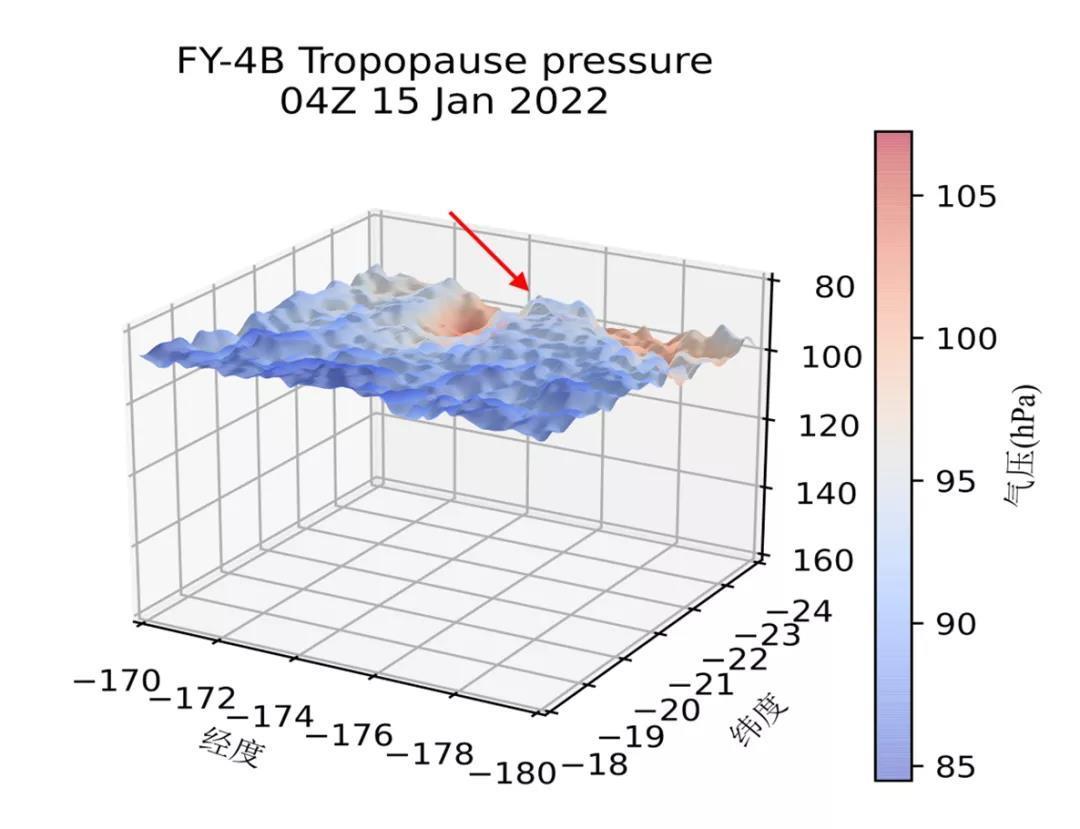 FY-4B汤加洪阿哈阿帕伊岛火山爆发对流层顶气压三维图(2022年01月15日19:00 汤加时)