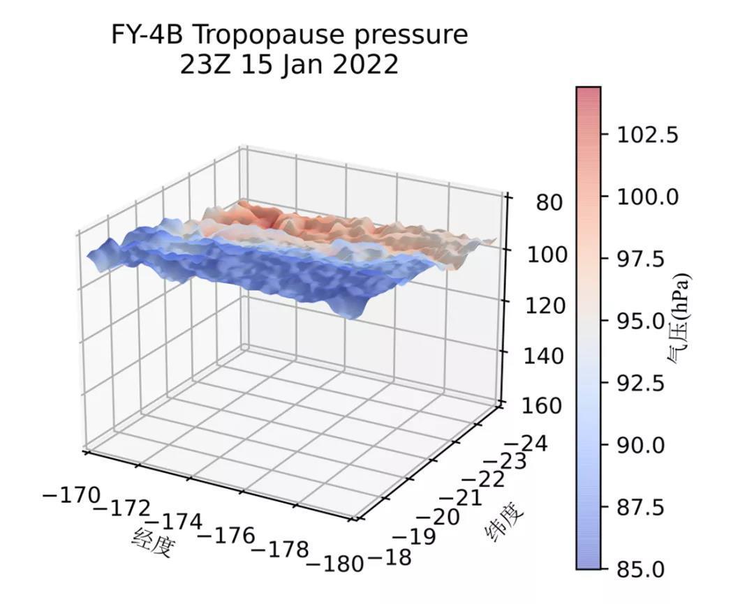 FY-4B/AGRI汤加洪阿哈阿帕伊岛火山爆发对流层顶气压三维图(2022年01月16日12:00 汤加时)