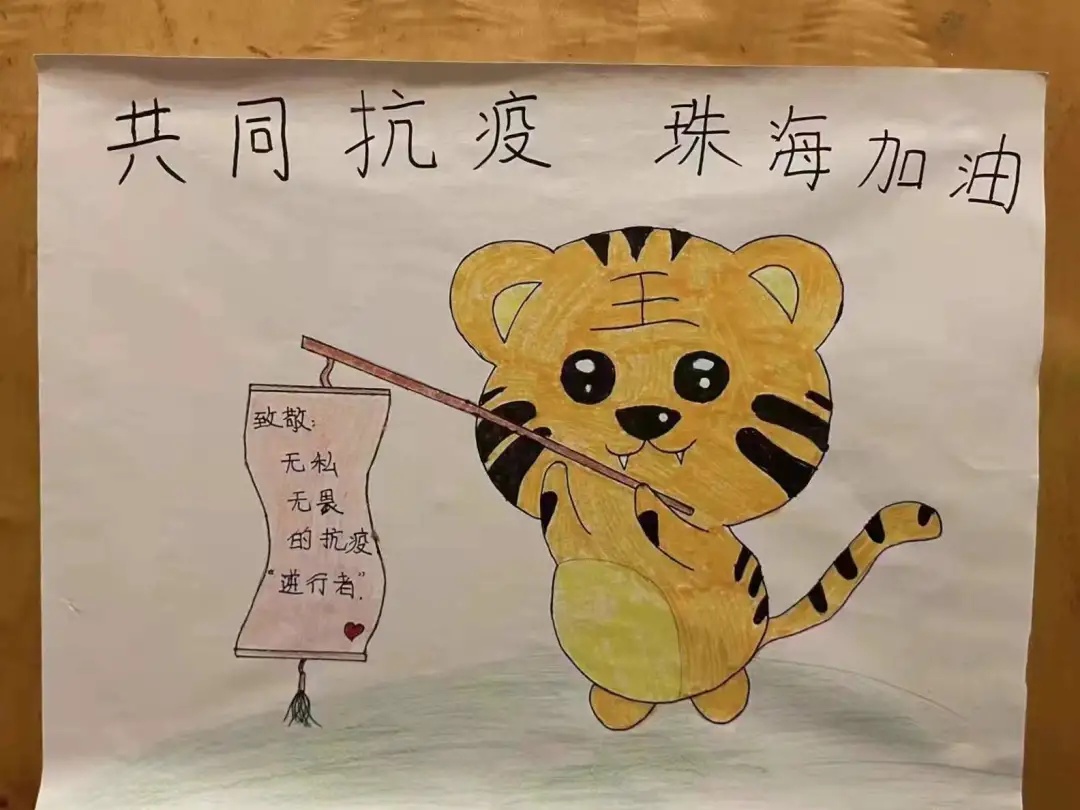 一天2次核酸检测、工作人员的昼夜不歇、忙前忙后,让小学三年级学生陈同学看在眼里、记在心里。16号,他突发奇想用画笔和文字寄托对工作人员的感谢和祝福,将虎年“虎虎生威”的寓意融合在画作里,致敬抗疫一线的工作人员。