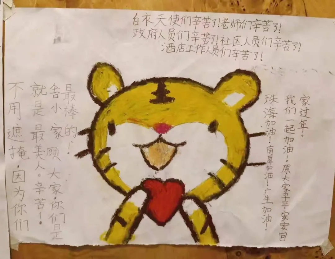 在这些简单稚嫩的画作里,画中笔笔皆真情。有的小朋友用自己的画笔记录着工作人员每天来来回回的工作,有的小朋友用小老虎来寄托对新的一年的美好期待。孩子们用自己的方式,表达着对工作人员悉心照料的感谢。