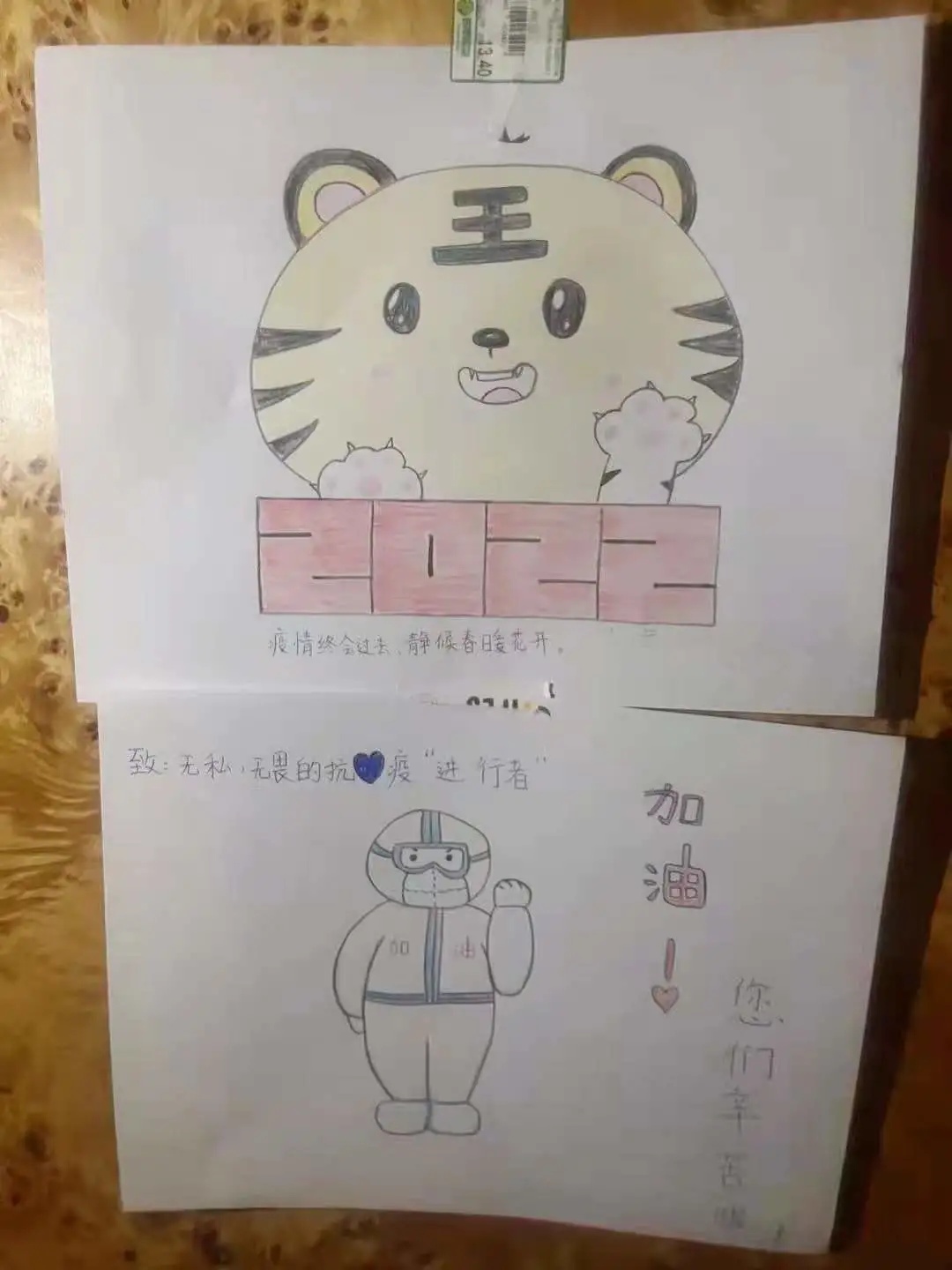 在这些画作里,有同学画了一个憨态可掬的“大白”,戴着护目镜和口罩,比着加油的手势。