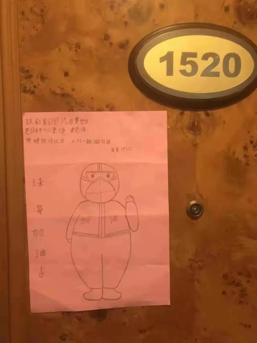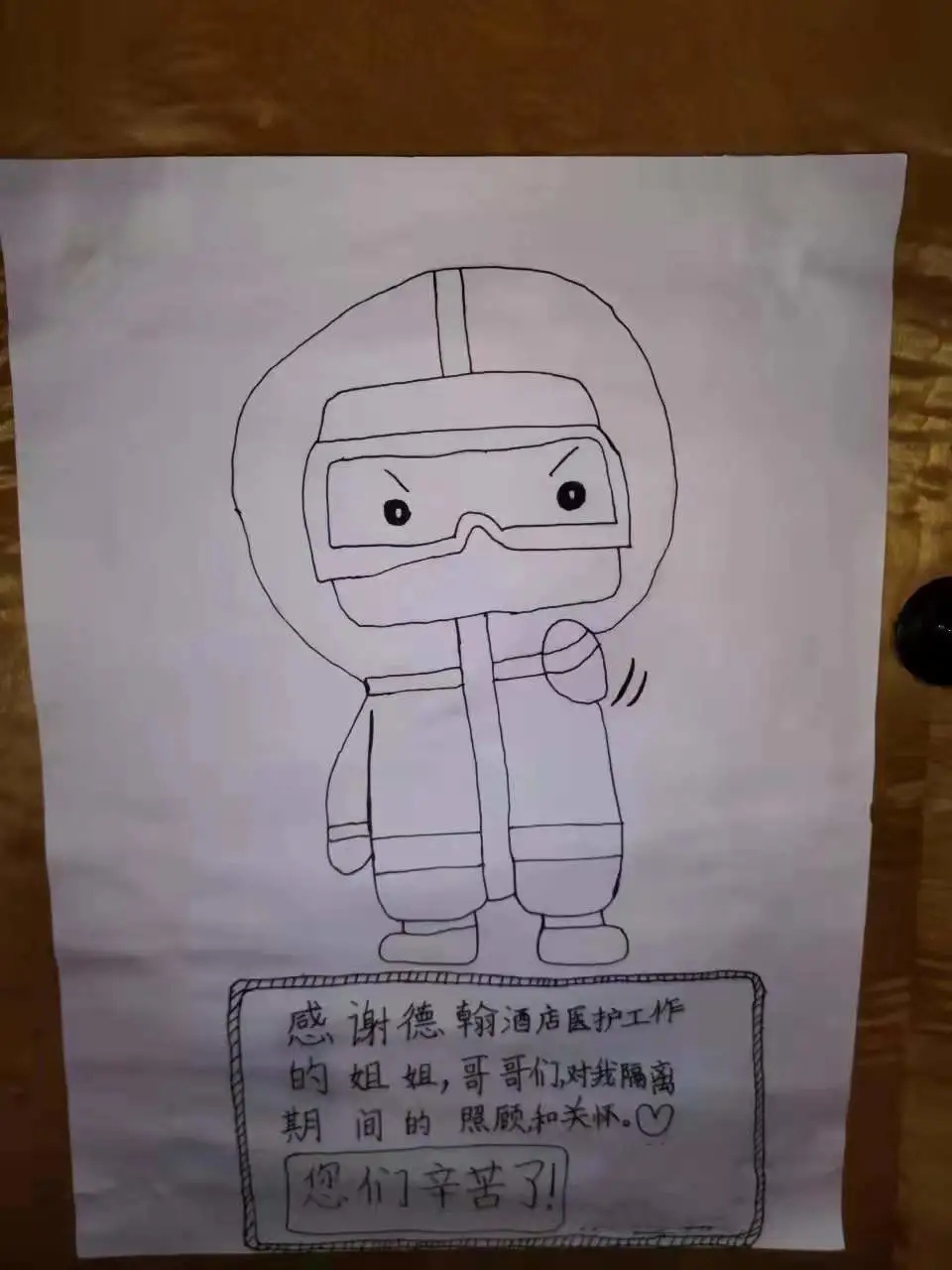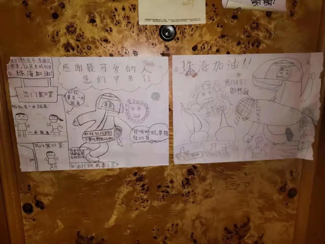 这两天,在德翰酒店隔离点的医护人员和酒店的工作人员发现,不少房间门口都贴着小朋友的手绘图画,这让他们心头一热。