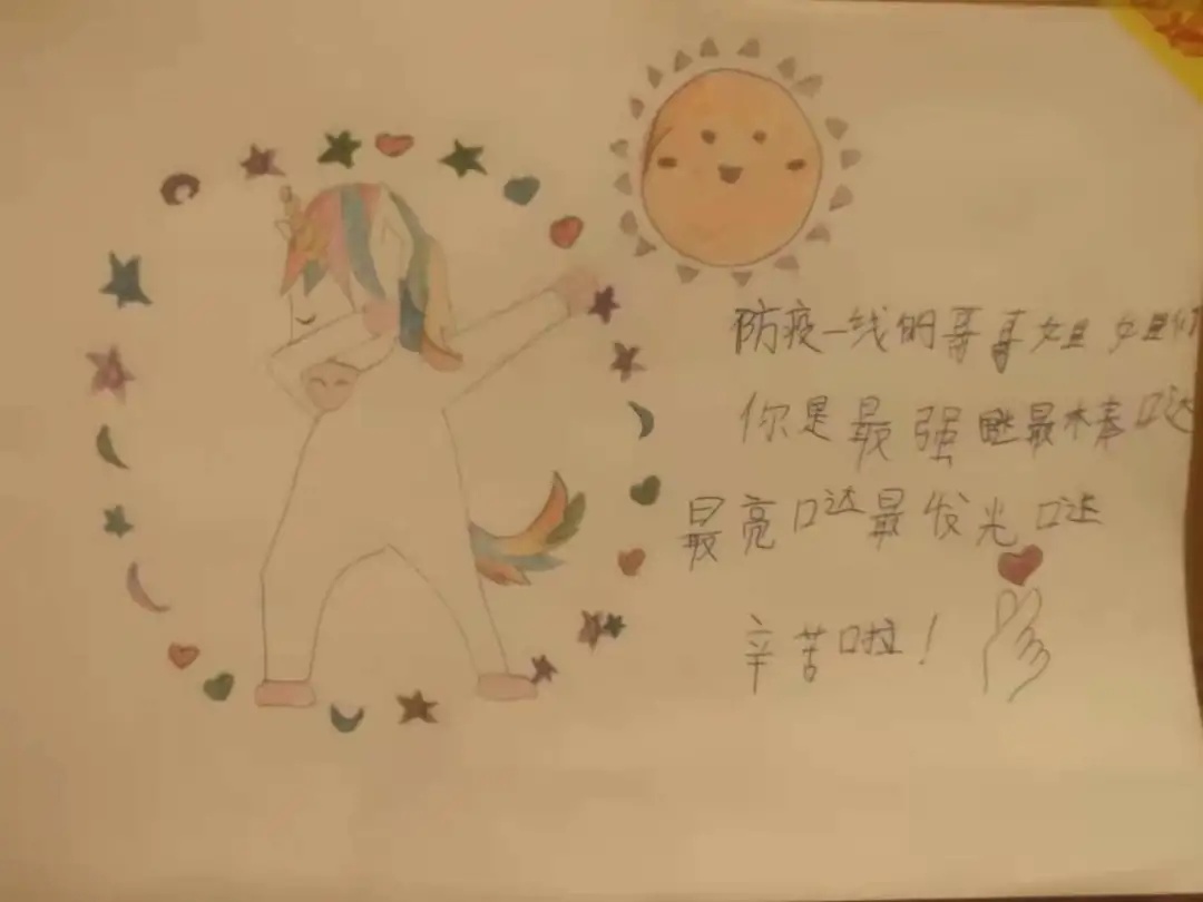 有同学画了一个太阳,配文写到“防疫一线的哥哥姐姐,你们是最亮哒最发光哒!”