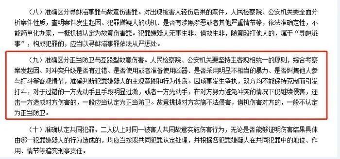 《意见》明确提出“准确区分正当防卫与互殴型故意伤害”,并指出,“因琐事发生争执,双方均不能保持克制而引发打斗,对于过错的一方先动手且手段明显过激,或者一方先动手,在对方努力避免冲突的情况下仍继续侵害,还击一方造成对方伤害的,一般应当认定为正当防卫”,“要坚持主客观相统一的原则,综合考察案发起因、对冲突升级是否有过错、是否使用或者准备使用凶器、是否采用明显不相当的暴力、是否纠集他人参与打斗等客观情节,准确判断犯罪嫌疑人的主观意图和行为性质。”