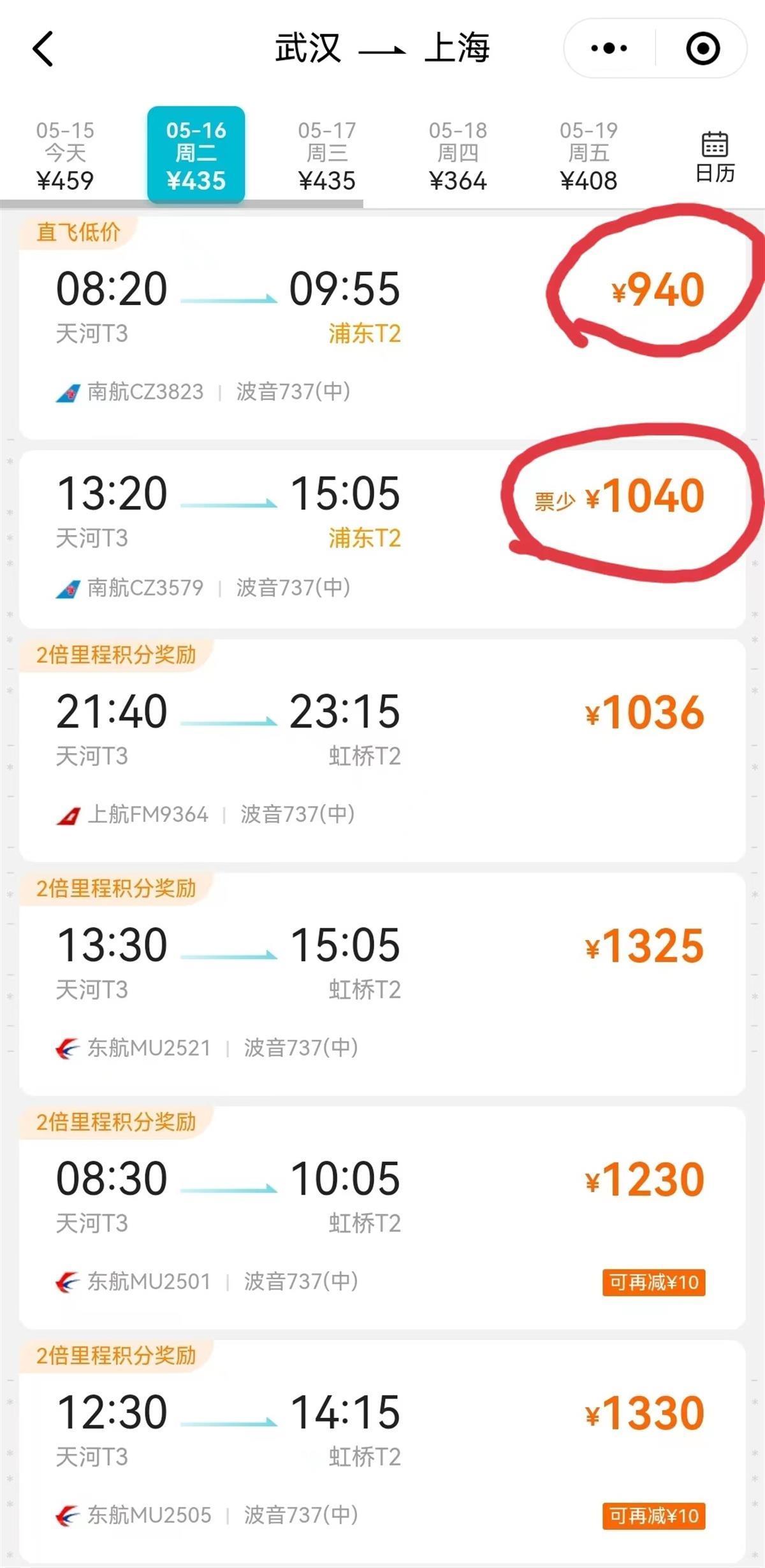以5月16日武汉飞上海为例,如果购买当日的直飞航班,机票价格普遍在900元以上,甚至有票价高达1040元的直飞航班。但如果选择中转航班,例如武汉飞北京,在上海中转,旅客飞抵上海则只需要599元。