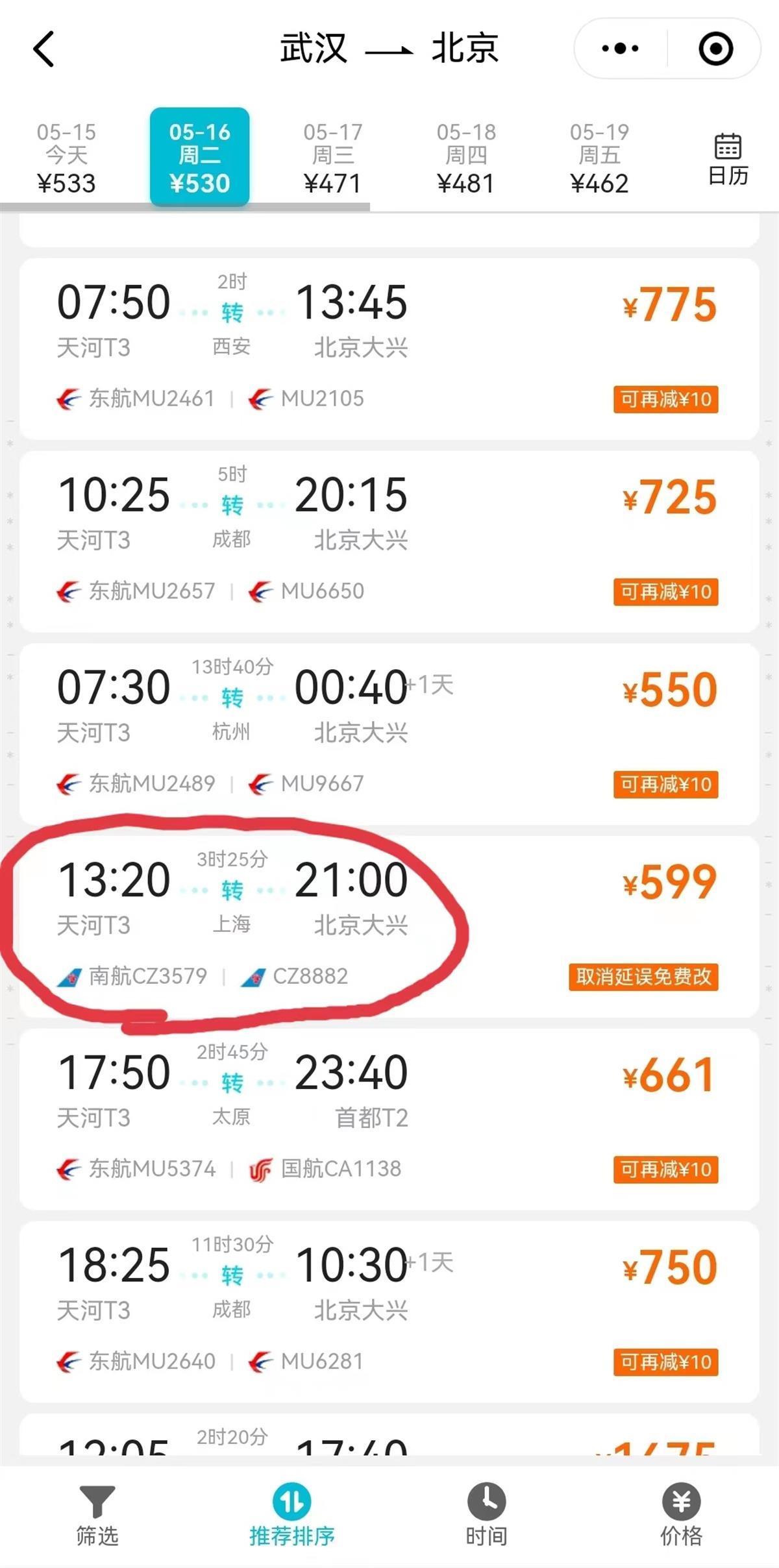 武汉飞北京,在上海中转,该航班票价仅需599元
