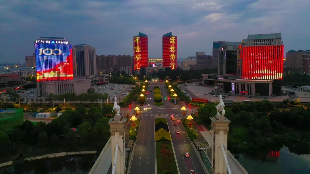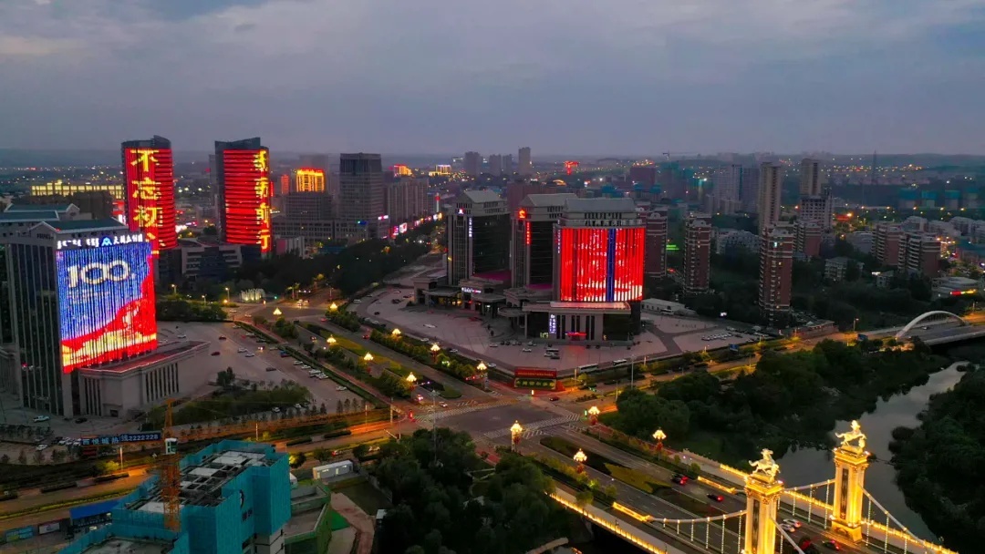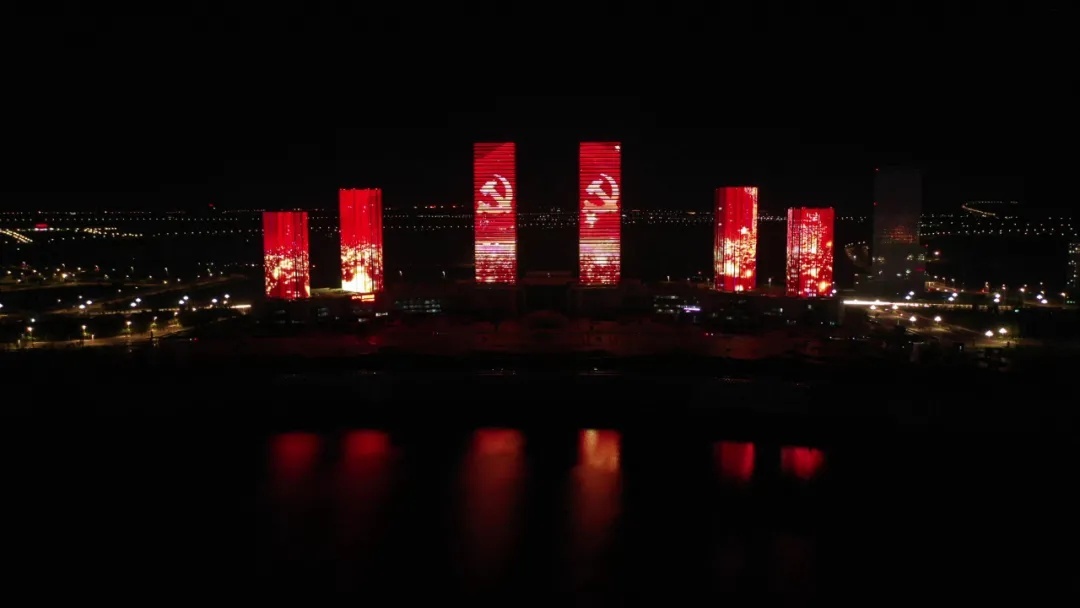 政务服务中心、国泰CBD等楼宇建筑上党旗飘飘,“百年征程 波澜壮阔、百年初心 历久弥坚”“坚定不移听党话 矢志不渝跟党走”等巨大字样滚动出现,向我们伟大的党做最深情的告白。