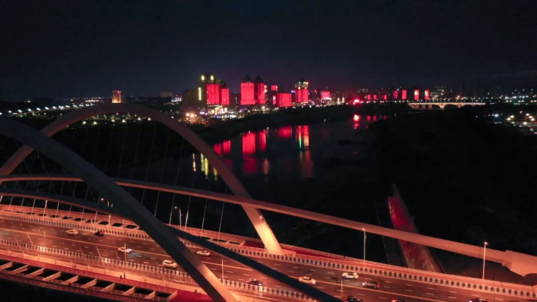 2号桥、3号桥、4号桥上灯火璀璨,游人往来如织,建党百年的标识处处可见,俨然成为城中一景,营造出“党的盛典、人民的节日”的浓厚氛围。