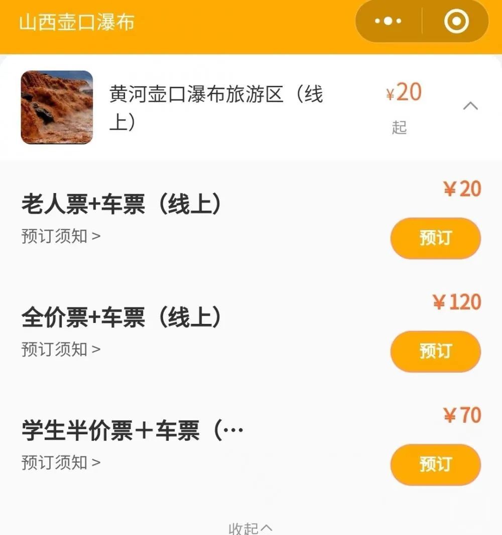 ▲壶口瀑布(山西侧)线上购票,门票捆绑车票一起售卖。