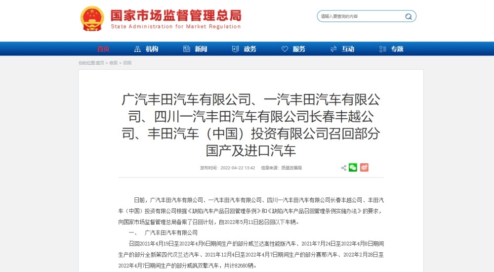 日前,广汽丰田汽车有限公司、一汽丰田汽车有限公司、四川一汽丰田汽车有限公司长春丰越公司、丰田汽车(中国)投资有限公司根据《缺陷汽车产品召回管理条例》和《缺陷汽车产品召回管理条例实施办法》的要求,向国家市场监督管理总局备案了召回计划,自2022年5月11日起召回以下车辆。