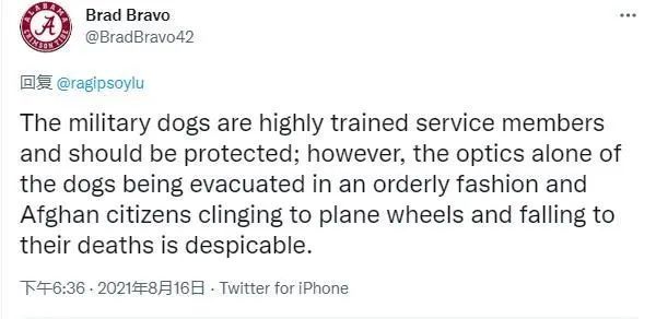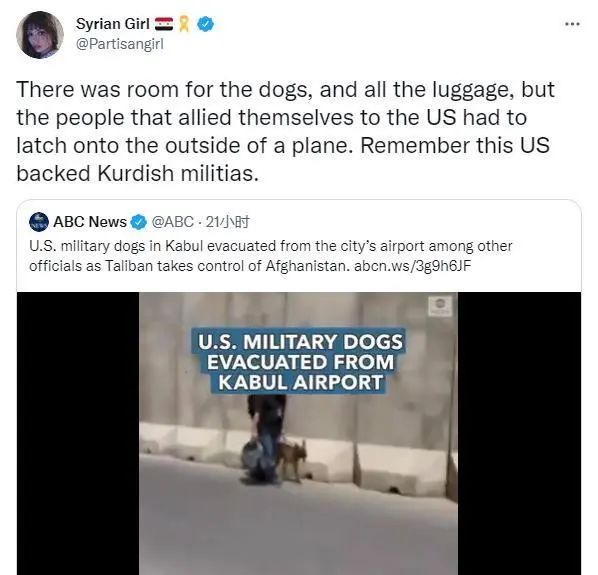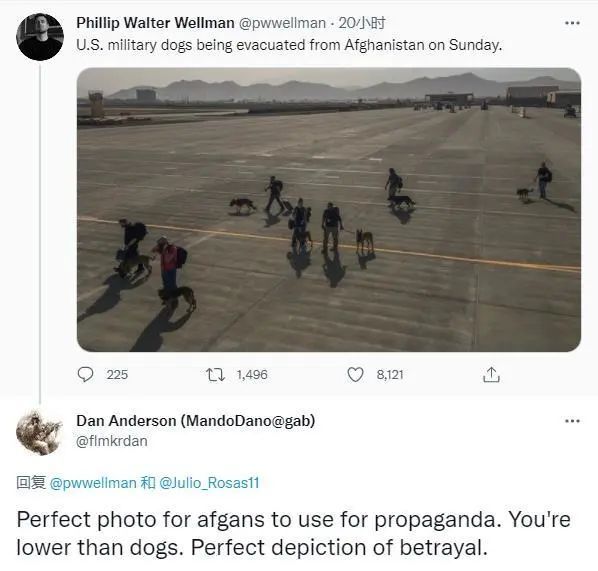 地缘政治分析师、RT撰稿人马拉姆·苏斯利发推文称,“(美国飞机上)有空间容纳狗和所有行李,但那些让自己与美国结盟的人不得不扒在飞机外面。”有网友指出,“军犬是经过高度训练的服役成员,应该受到保护;然而,仅仅是狗被有序地撤离,阿富汗公民抓住飞机轮子并掉下来摔死的画面就很卑鄙。”“阿富汗人用来做宣传的完美照片。你比狗还卑微。这是对背叛的完美描绘。”还有网友称,“美国拯救了狗而不是阿富汗人的生命。”