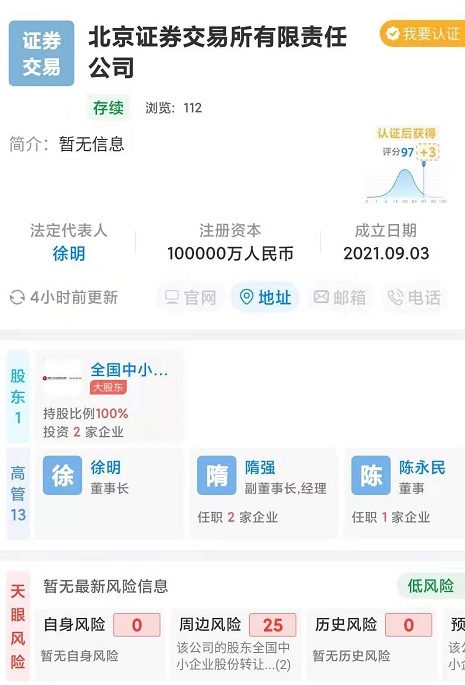 天眼查显示,北京证券交易所有限责任公司由全国中小企业股份转让系统有限责任公司100%持股,是其唯一股东。公司董事长徐明,也是全国中小企业股份转让系统有限责任公司董事长。公司副董事长、总经理为隋强。此外,公司董事还有陈永民、李继尊、贾文勤、李永春、张梅、周贵华、王宗成、王丽。公司监事会主席为党小卉。