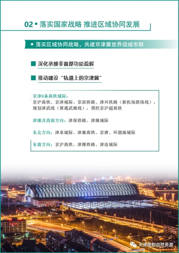 突出天津背倚京津冀世界级城市群、面向东北亚的区域门户作用,以及作为“一带一路”建设的海陆交汇枢纽的交通区位优势,从对外开放、服务人民、高效集约发展、保护环境等角度,提出建成便捷顺畅、经济高效、绿色集约、智能先进、安全可靠的现代化高质量综合交通体系的发展目标。重点发挥天津港服务区域功能,提升海港国际航运核心区功能,构建“京津冀开放大通道”。全面提升空港辐射能力,塑造服务京津冀、链接洲际的综合性航空枢纽和国际航空物流中心。形成对外构建畅联京冀、辐射全国、链接全球的广域综合交通体系。