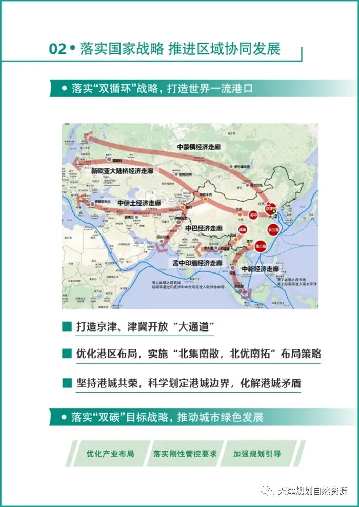 努力打造世界一流的智慧港口、绿色港口,充分发挥国内国际双循环的战略支点、国内大循环的重要节点的作用,推动京津冀协同发展,共建“一带一路”。一是打造京津、津冀开放“大通道”。联通京津冀及“三北”地区,辐射东北亚、连通欧日韩,提升国际航运核心区功能,拓展航运服务辐射范围,强化全球资源配置能力。二是优化港区布局,实施“北集南散,北优南拓”的总体空间布局策略。进一步集聚国际船舶代理、海洋科研科技等功能,推动自贸区升级。三是坚持港城共荣,科学划定港城边界,化解港城矛盾。