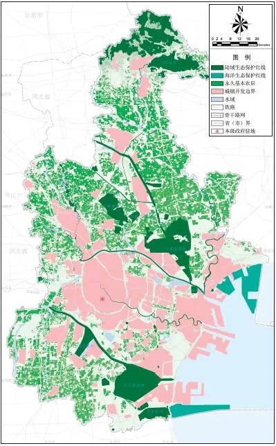 落实中共中央办公厅、国务院办公厅印发的《关于在国土空间规划中统筹划定三条控制线的指导意见》,科学划定永久基本农田保护红线、生态保护红线、城镇开发边界三条控制线,强化底线约束,加快形成绿色生产、生活、生态空间,统筹绘制天津市域国土空间发展“一张蓝图”。
