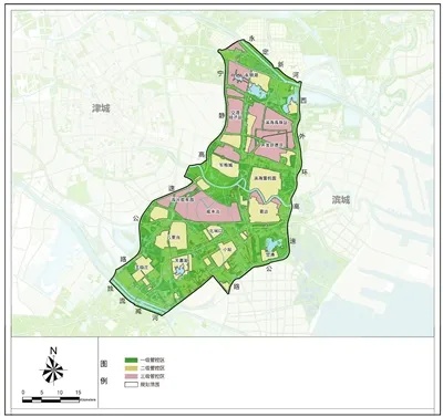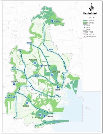 “三区”即北部盘山—于桥水库—环秀湖生态建设保护区、中部七里海—大黄堡—北三河生态湿地保护区和南部团泊洼—北大港生态湿地保护区;“两带”即西部生态防护带和东部国际蓝色海湾带;“中屏障”则指双城中间绿色生态屏障。“一市”即中心城市,是城市功能集聚的主体地区;“双城”指津城和滨城;“多节点”即武清城区、宝坻城区、静海城区、宁河城区、蓟州城区。