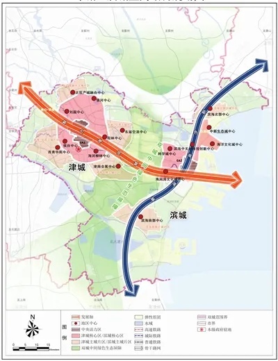 构建“双城、双轴、中屏障”的城市空间结构。“双城”指现代活力津城和创新宜居滨城,“双轴”指魅力海河轴和蓝色海湾轴,“中屏障”即双城中间绿色生态屏障。