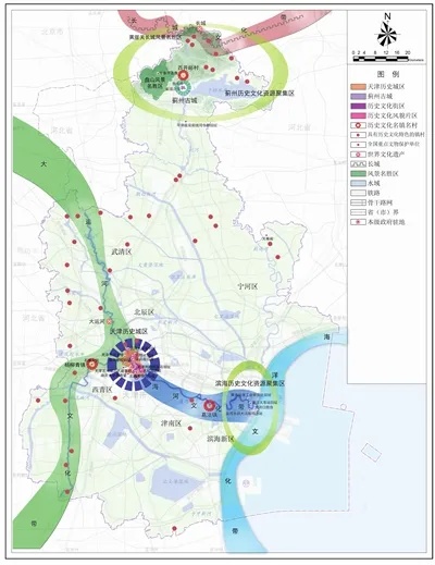贯彻落实习近平总书记提出的“留住历史根脉,传承中华文明”的重要指示精神,全面梳理了历史文化资源,构建了“一城、双区、四带、多点”的历史文化风貌保护格局。进一步推动历史城区保护与复兴,强化整体保护。挖掘蓟州、滨海两片历史文化资源区,拓展保护对象。加强大运河、长城、海河以及海洋四条文化带保护和利用,构筑京津文化高地。突出对历史文化名镇、名村以及不可移动文物、历史风貌建筑、非物质文化遗产等历史文化遗产的保护和活化利用。同时运用城市设计塑造我市“大气、文雅、精致、有品位”的城市建设风貌。