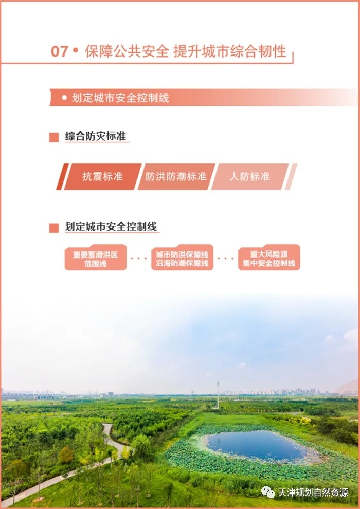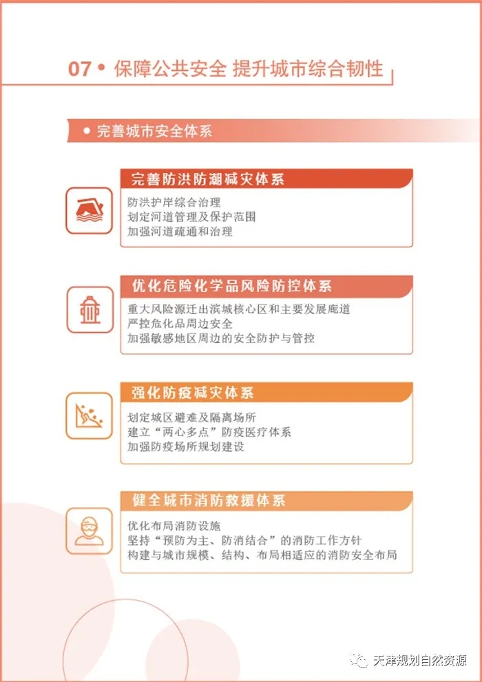以构建京津冀地区大安全格局、保障首都安全为指导思想,以构建安全韧性城市为目标,通过灾害风险评估,科学辨识影响城市安全的自然灾害、公共卫生、社会安全等风险因素,针对天津面临的水资源短缺、危化品风险、海平面上升、地面沉降、卫生防疫风险等问题提出规划措施,提升灾害和疫情等突发事件应急响应能力。