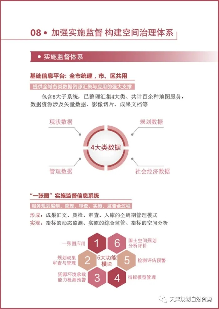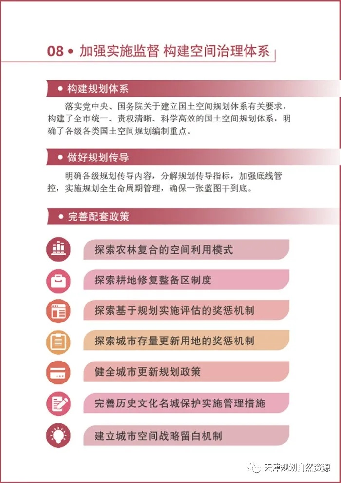 一是构建规划体系。落实党中央、国务院关于建立国土空间规划体系有关要求,构建符合天津实际的国土空间规划体系,明确了各级各类国土空间规划编制重点。二是做好规划传导。明确各级规划传导内容,分解规划传导指标,加强底线管控,实施规划全生命周期管理,确保一张蓝图干到底。三是探索配套政策体系。在农林复合的空间利用模式、耕地修复整备区制度、城市存量更新用地奖惩机制、城市空间战略留白机制、乡村振兴发展用地保障等方面进行创新探索,促进国土空间优化,保障规划有效实施。四是完善实施监督体系。建立国土空间基础信息平台和“一张图”实施监督信息系统,为规范国土空间规划编制、统一国土空间用途管制、强化规划实施监督提供技术支撑。