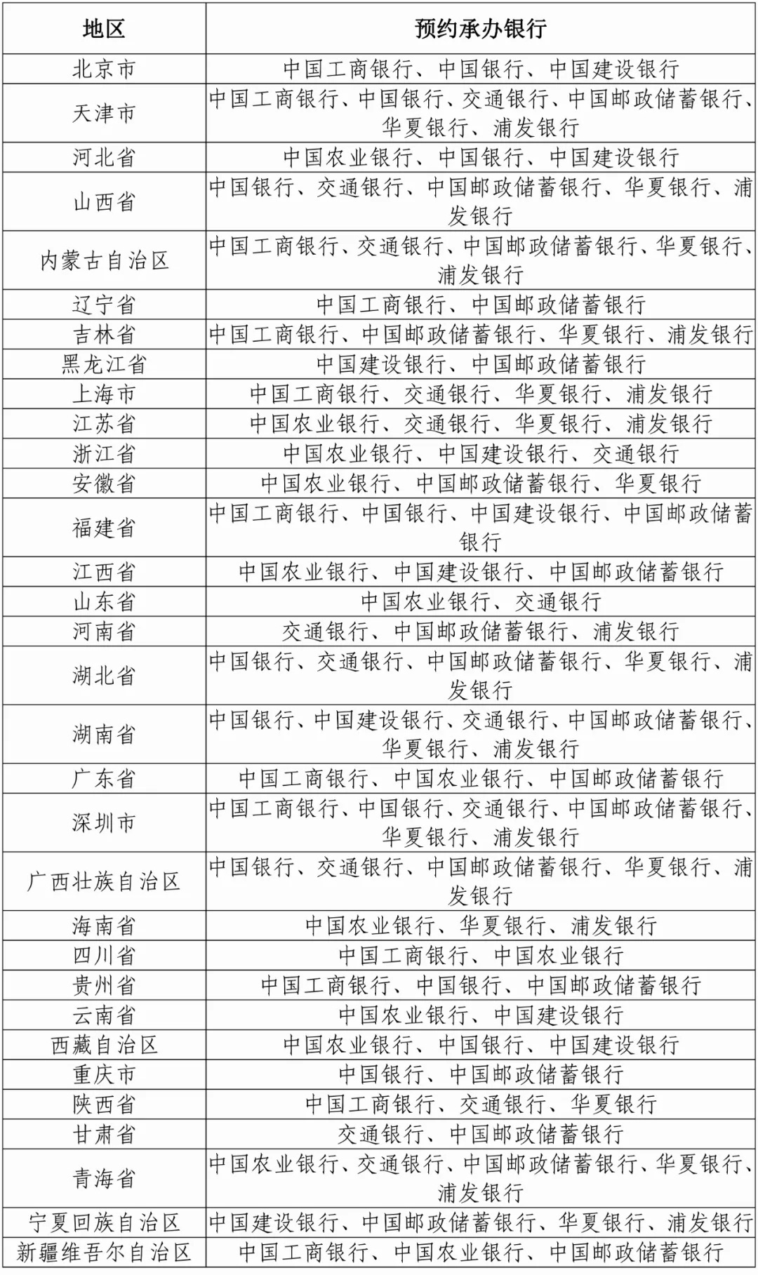 中国工商银行、中国农业银行、中国银行、中国建设银行、交通银行、中国邮政储蓄银行、华夏银行、浦发银行(以下统称预约承办银行)共同承担第24届冬季奥林匹克运动会铜合金纪念币的预约兑换工作。各地区具体安排如下: