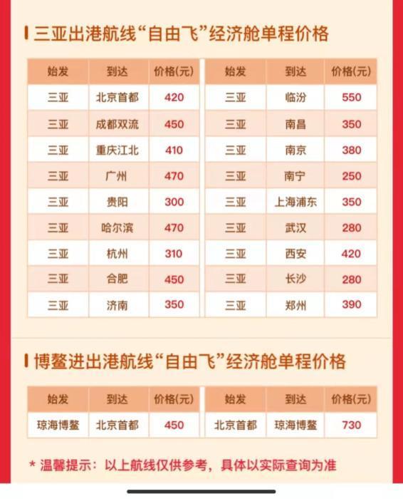 海航三亚出港航线“自由飞”经济舱单程价格截图。