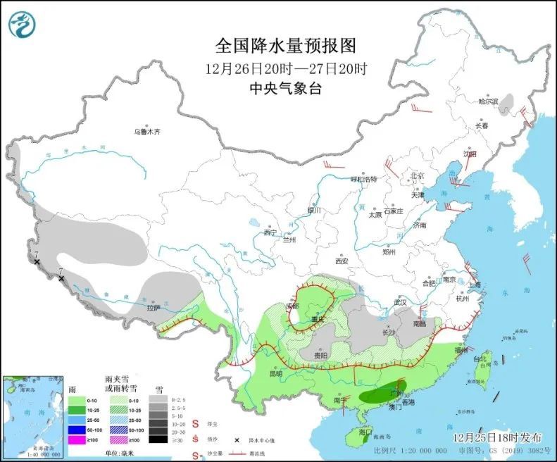 当前,寒潮主体已全面南下,12月25至27日,我国南方大部及西北地区将出现4级至5级偏北风,阵风6级至8级;气温普遍下降6℃至10℃,其中,贵州西南部、广西中南部、广东西南部等地的部分地区降温10℃至12℃,局地降温12℃以上;27日至28日,最低气温0℃线将位于华南北部至贵州南部一带,南方地区可能迎来最冷时段,华南沿海部分地区温度将跌至个位数。