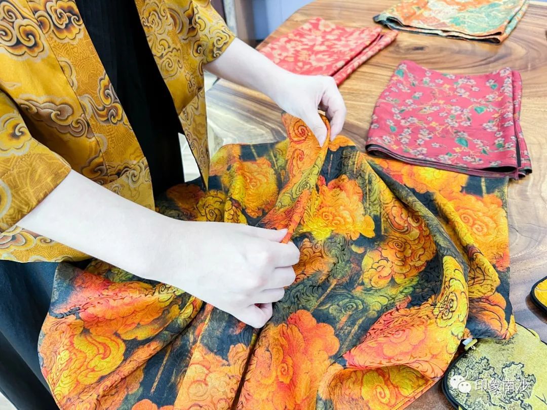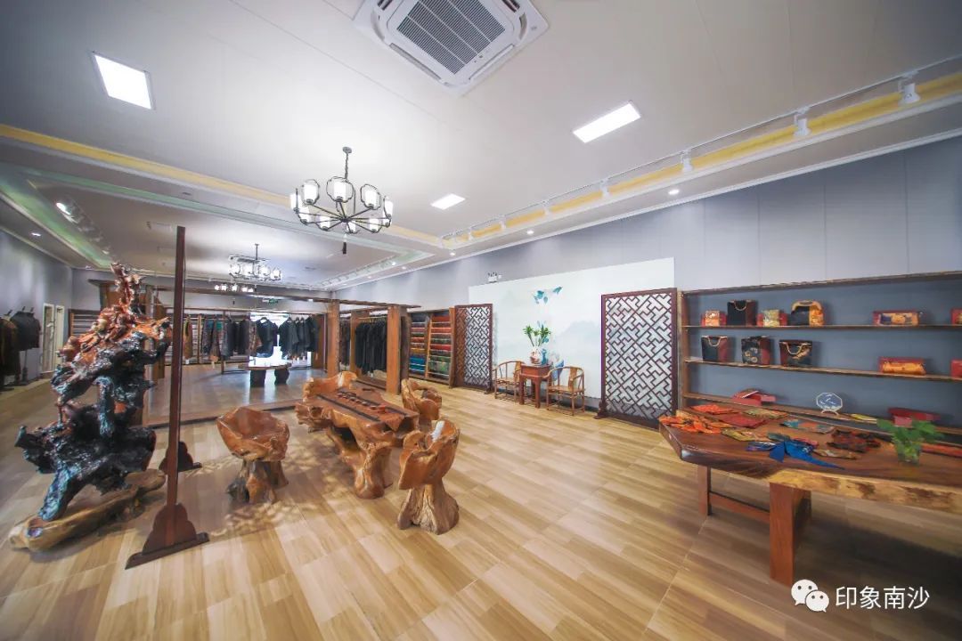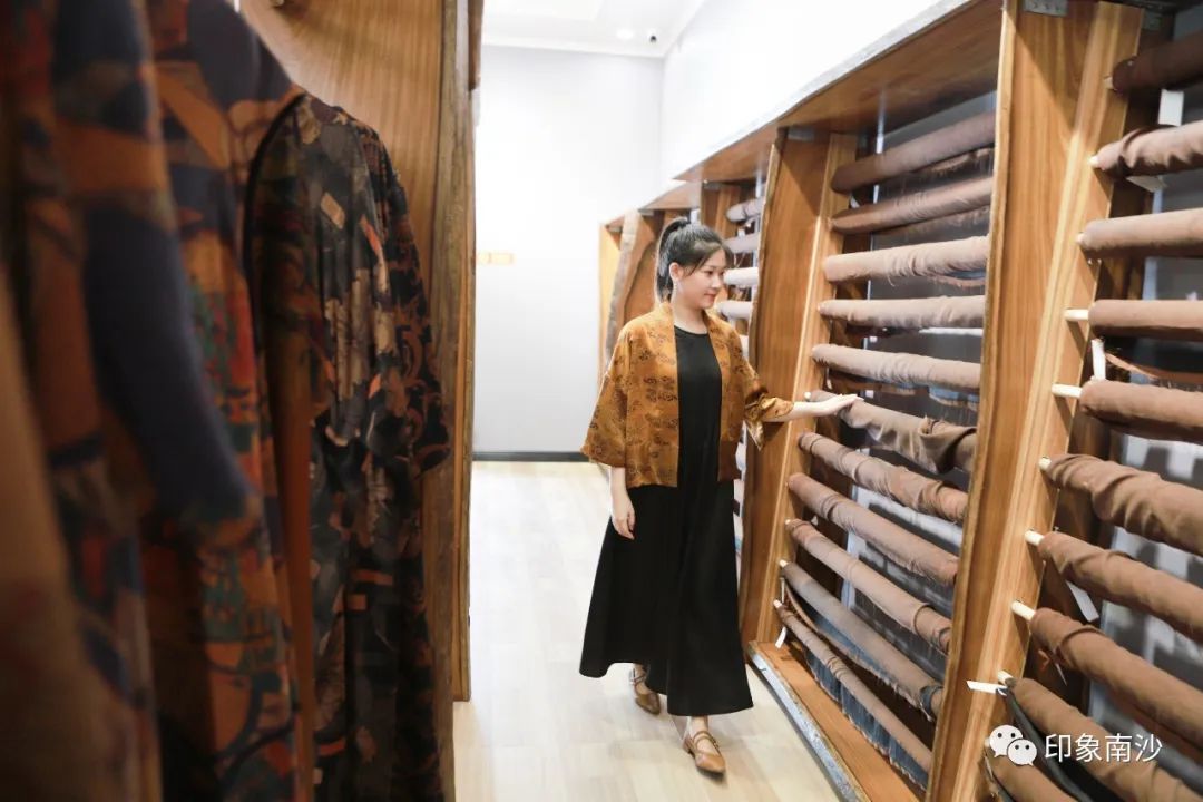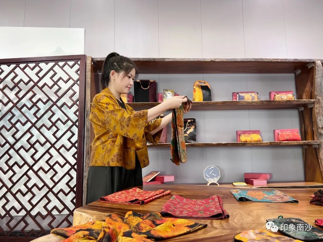 销售中心的右方则主要展示各种香云纱制作而成的小物件,如手袋、丝巾和茶垫,还有结合时下年轻人的通勤习惯推出的手机袋等等。花色精美的祥云印花最让小姐姐爱不释手。