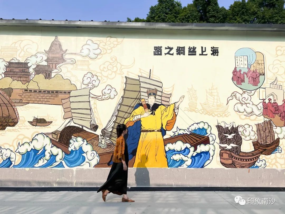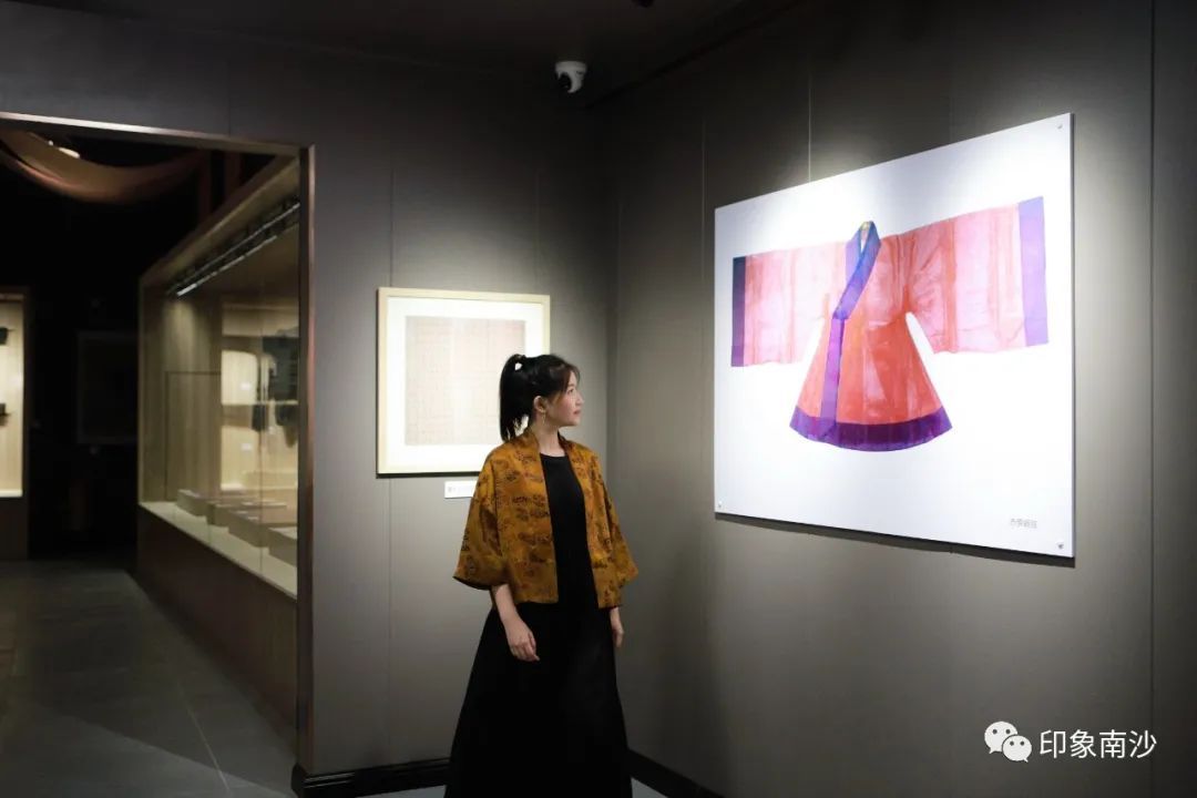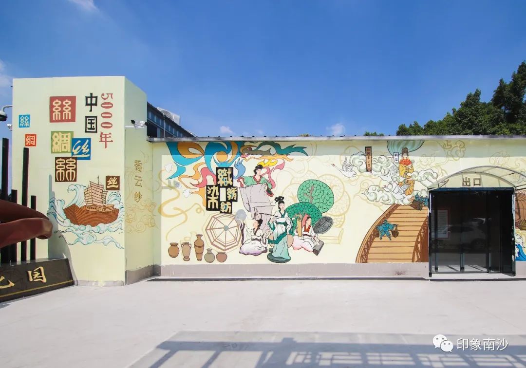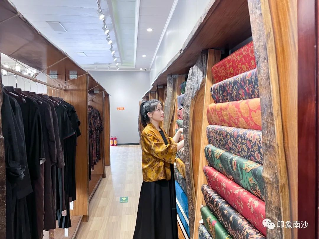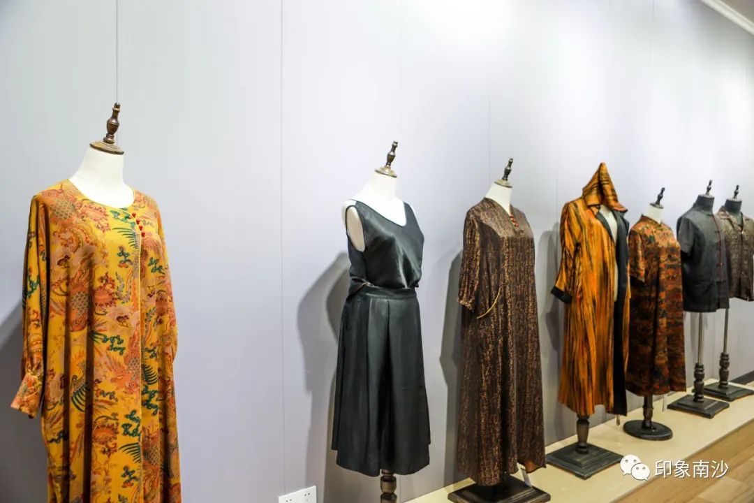 园区墙上色彩鲜丽的壁画生动地描绘着广州海上丝绸之路,妈祖文化,以及香云纱染织工艺。步入成品展示中心,我们便可看见各式各样由香云纱制作的精美成品。
