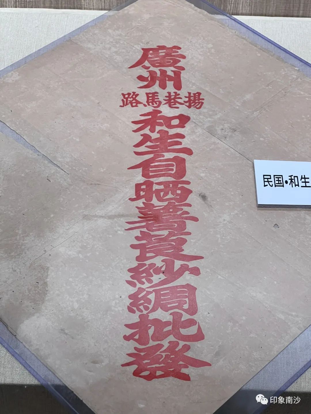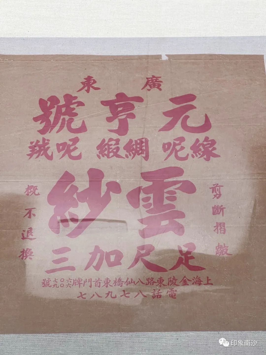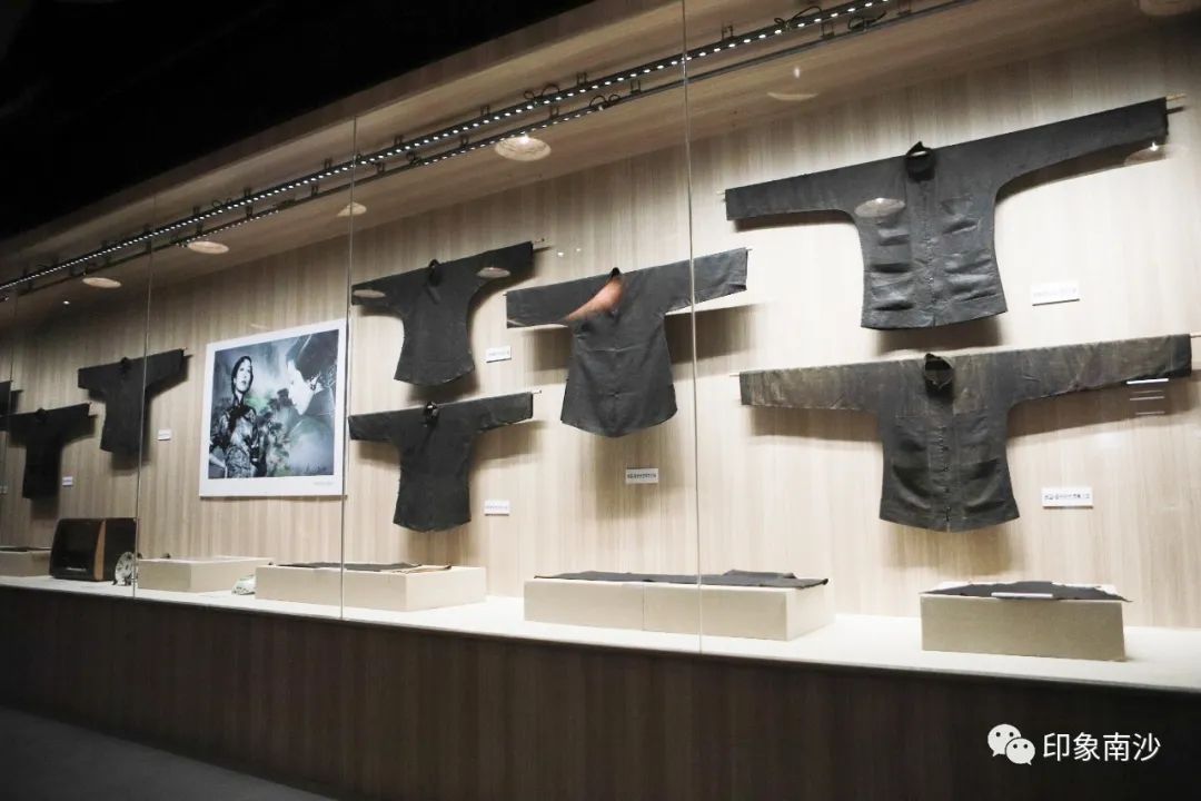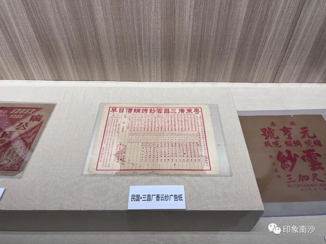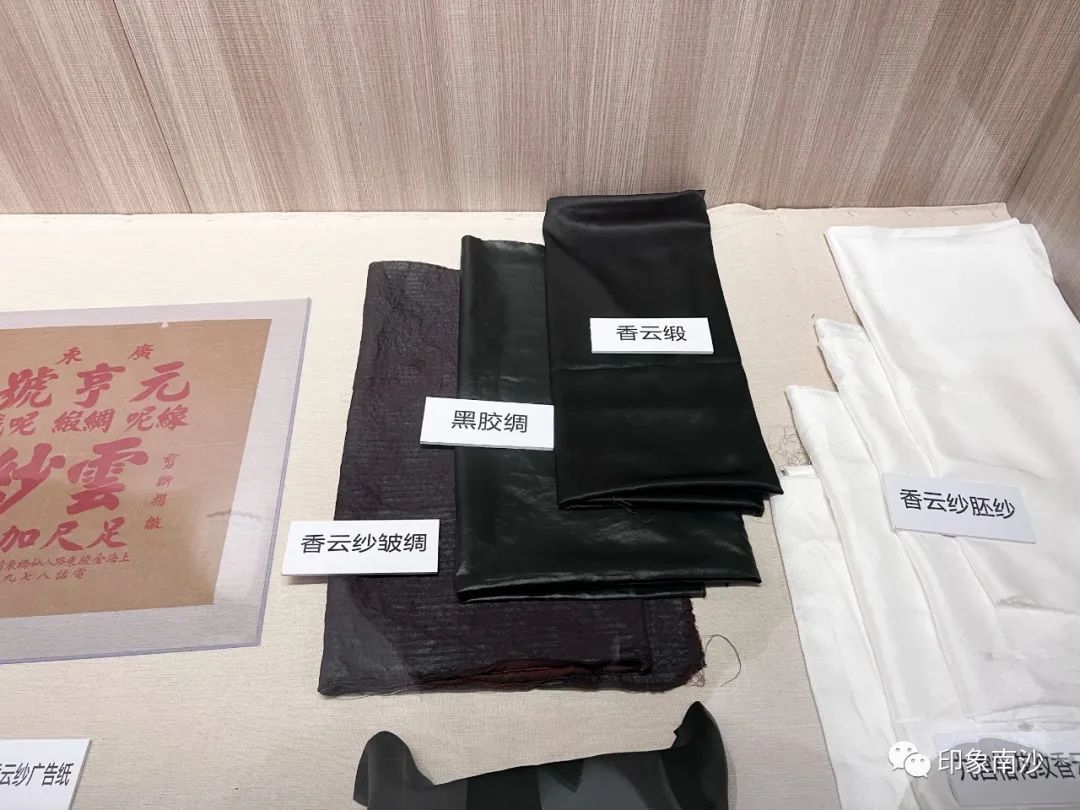 走进第三展厅,关于香云纱的不同布料、民国时期的广告纸、其他物品和香云纱的民间衣物被整齐陈列。