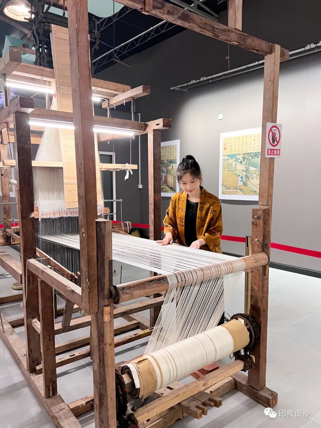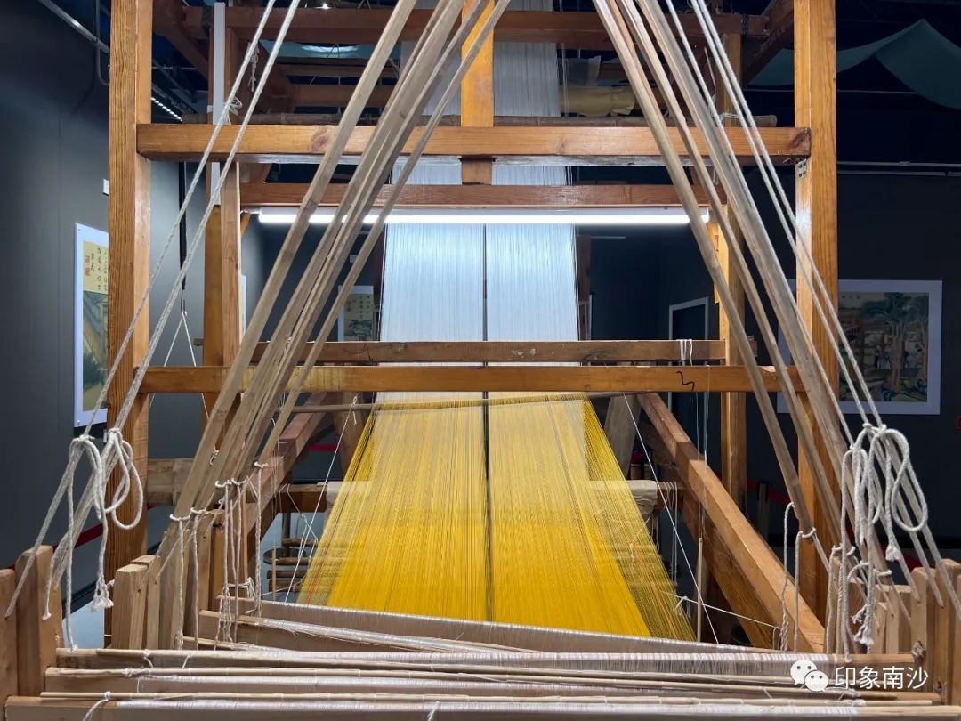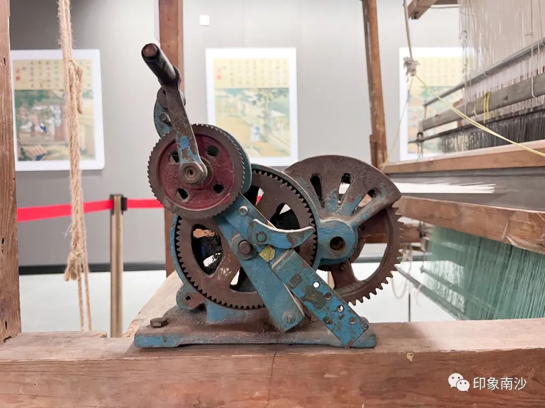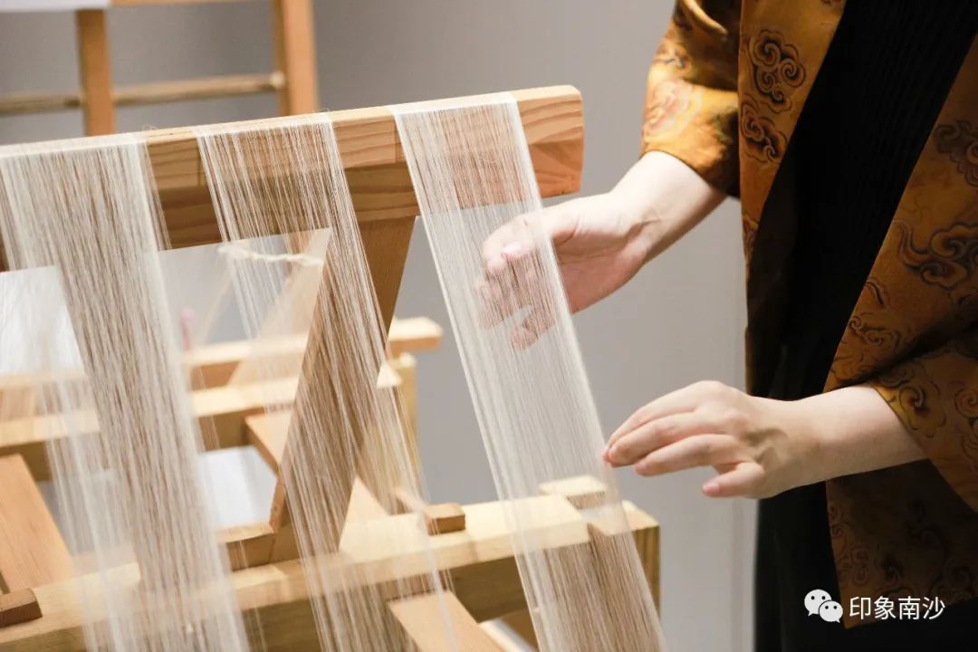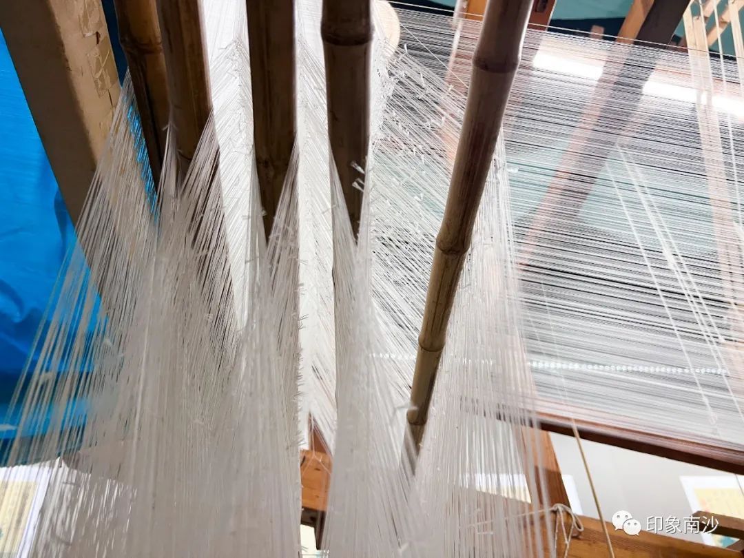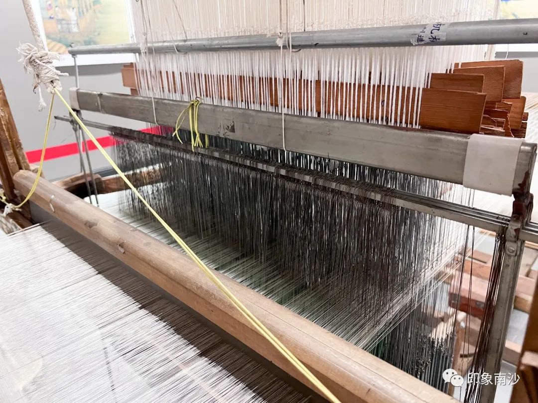 最后的第四展厅主要展示了多台香云纱白坯纱的织机,力求还原白坯纱的生产流程。手工织造白坯纱的工序非常繁复,主要由解丝(搅丫头)→拔丝→煮采→浆经油经→打纬、结综、打花纸→织造六个工序组成。