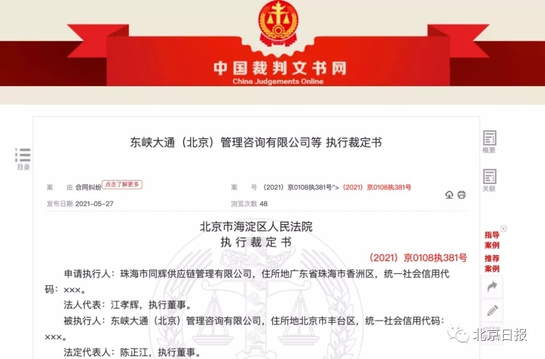 据中国裁判文书网,(2021)京0108执381号执行裁定书显示,今年5月份,北京市海淀区人民法院曾通过法院财产调查系统对被执行人东峡大通(北京)管理咨询有限公司的银行存款、车辆、房产、证券等进行调查,未发现可供执行的财产。现申请执行人暂不能向本院提供被执行人东峡大通(北京)管理咨询有限公司的下落及其他可供执行的财产线索。本院已对被执行人东峡大通(北京)管理咨询有限公司采取限制消费措施。