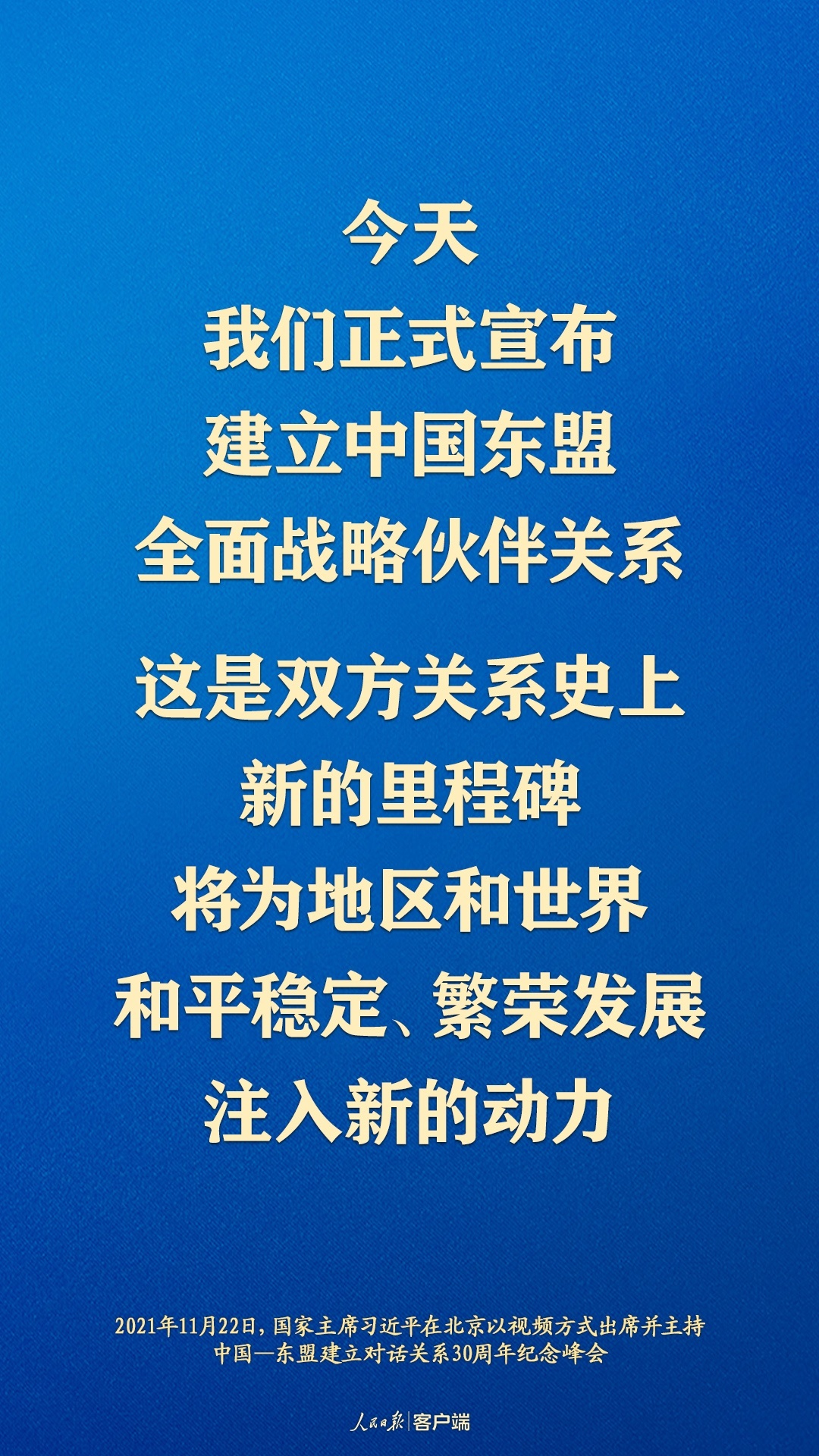 习近平指出,今天,我们正式宣布建立中国东盟全面战略伙伴关系。这是双方关系史上新的里程碑,将为地区和世界和平稳定、繁荣发展注入新的动力。