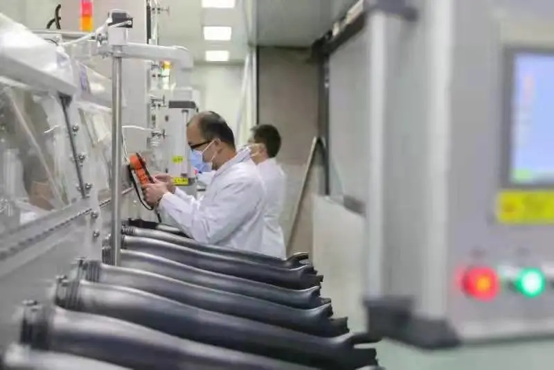 科研人员正在调适全自动软包电池生产线。