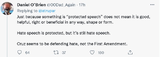 比如下图中这位美国网民就指出:科鲁兹其实不是在捍卫言论自由,而是在捍卫仇恨言论,因为即便敬纳粹军礼是“被保护的言论”,也不代表这种言论就是正确的,即便仇恨言论是“被保护”的,但那仍然是仇恨言论。