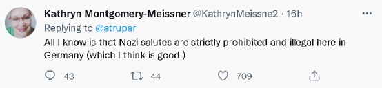 一位生活在德国的美国网民还补刀说:反正敬纳粹军礼在德国是被严格禁止的违法行为。